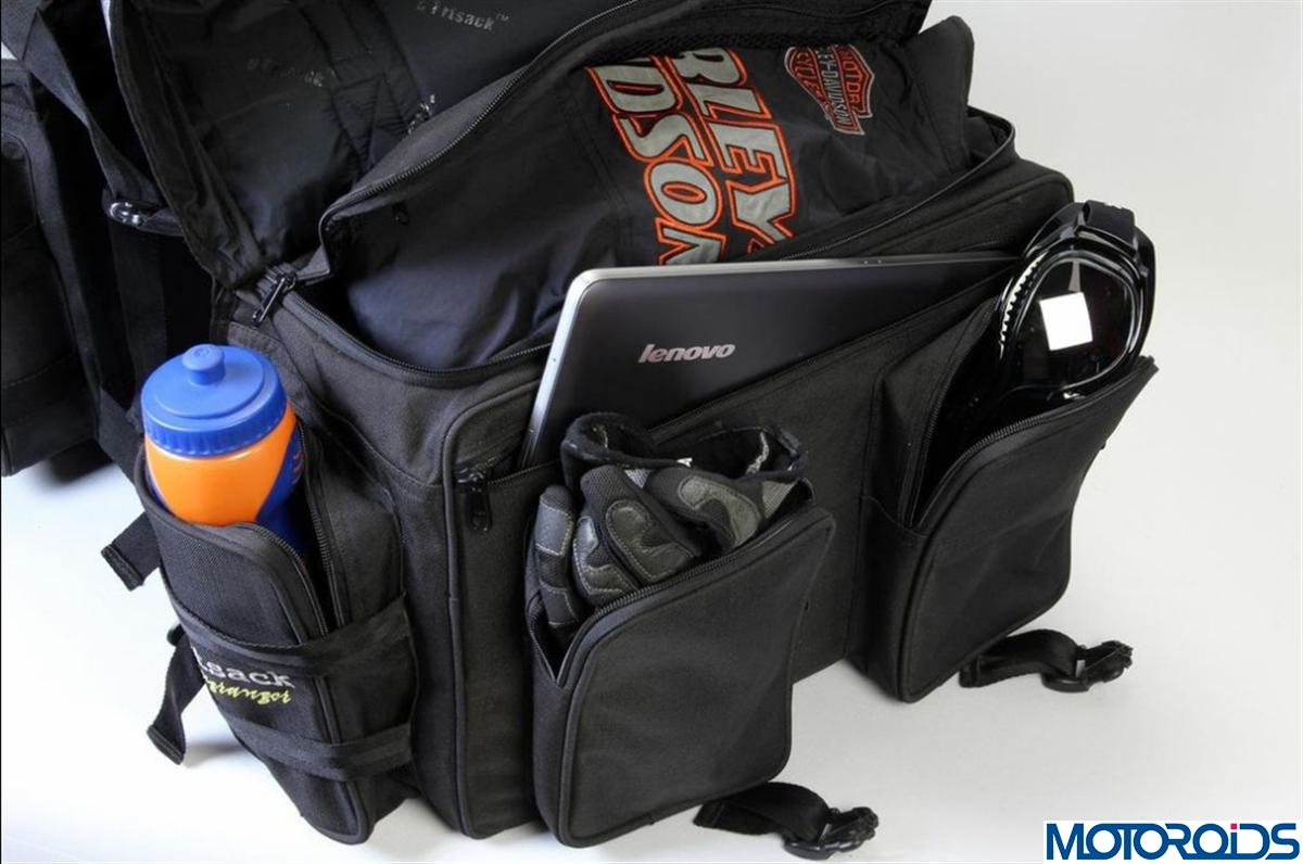 The quality and durability quotient is further demonstrated by the seams being bound on the inside with the stress points provided with ample reinforcement. The buckles are moulded out of high grade yet flexible plastic that adopt a firm locking mechanism unlike regular buckles where the plastic seems to lose their flexibility and tend to pull out of the slot under tension. The saddlebags are in fact two different units with links being held together by seatbelt material straps and industrial Velcro. The gap could be adjusted according to rear seat width and load capacity. Also extra straps with quick-release buckles have been put at various places to hold the luggage at points such as side shocks, rear fender and back rests/ grab rails etc. Bloggers or riders who love documenting their ride on the move can carry their laptops in a 14” cushioned laptop pocket.