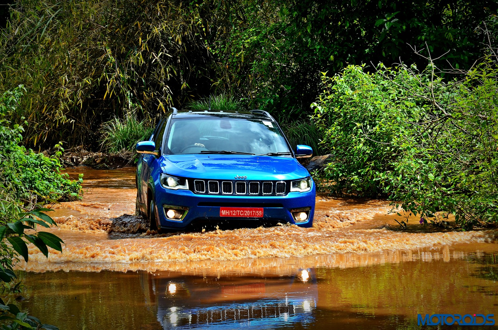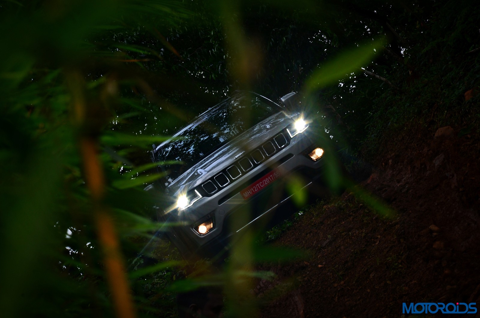 Dismissing a section filled with boulders and another where they had laid some tree trunks horizontally, we reached the top which then broke out into a tight right hander that plummeted down as a pretty steep track and offered little traction. As we modulated the brakes and begun a gentle descent, the air curtain under the Compass’ front bonnet skillfully displayed its retractable qualities as it hit decent sized rocks.
