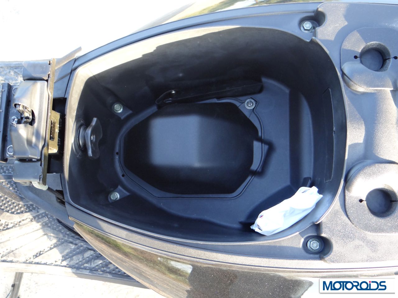 The storage space is adequate to keep a open face helmet or a small handbag