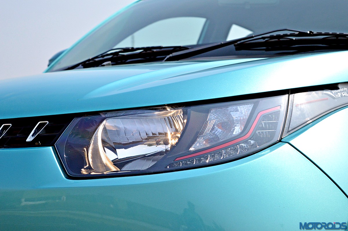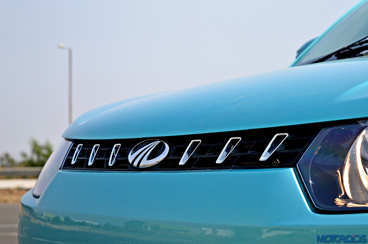 Vaguely representing the arms of sunglasses, these elements emanating from the headlamps bear mFalcon branding (which represents the new family of engines) on the LHS and KUV100 branding on the RHS.