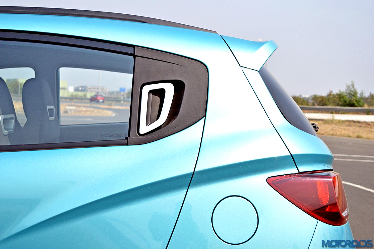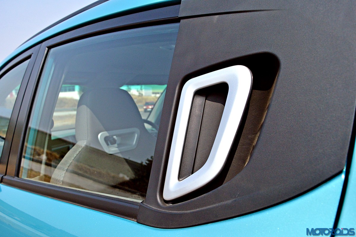 The KUV100 gets high mounted rear door handles a-la Chevrolet Beat; top-level trims get dull silver trimmed surrounds for them.