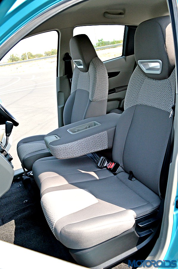 The KUV100’s front passenger seat features an extension that allows for a third occupant to settle in between the passenger and the driver – a la Datsun GO and GO+. The arm-rest doubles up as the central occupant’s backrest not used as one. This unique 3+3 seating makes the KUV100 the only vehicle in its segment to offer 6 seats.