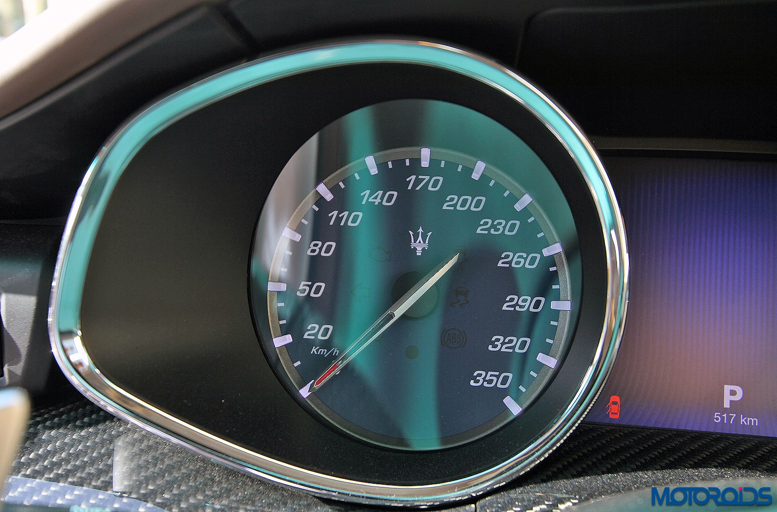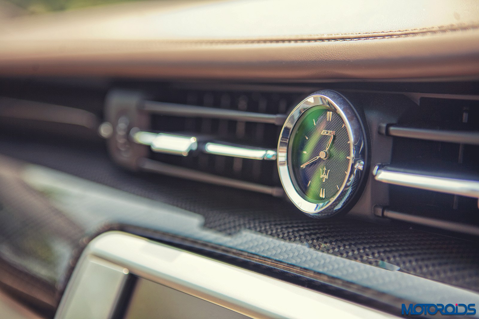 Attention to detail can be seen all around, right from of the cubby holes in the central console being lit, classy ambient lighting of the dashboard, little GTS emblem in the analog watch, Maserati logo on seat headrests and the Quattroporte decal on passenger side dashboard . We simply loved the interiors – there was one disappointment, though. The central screen and the buttons surrounding it, which control several functions such as heated seats, audio, phone etc do not match the quality and finesse of the rest of the car. The resolution could’ve been much better and there the controls felt somewhat laggy. The setup is quite functional though.