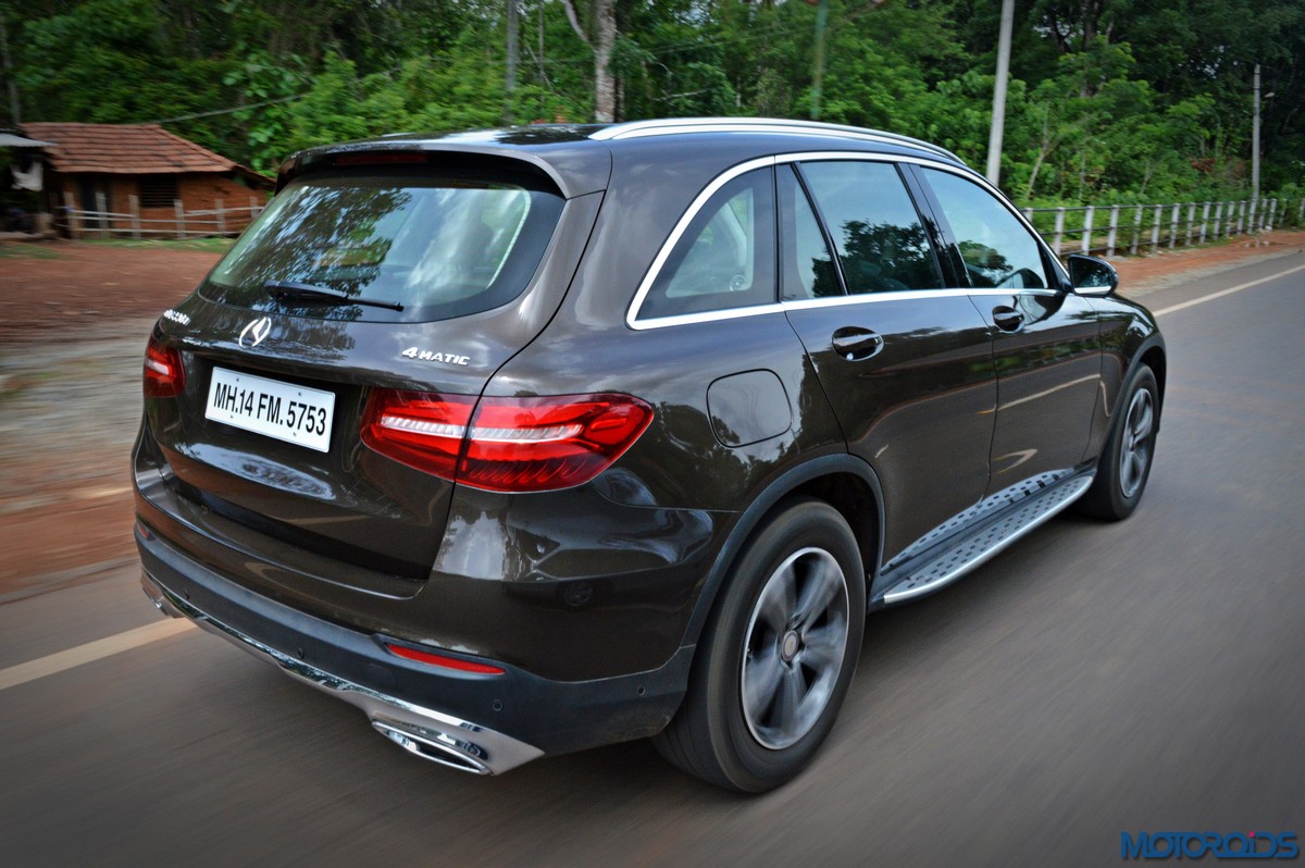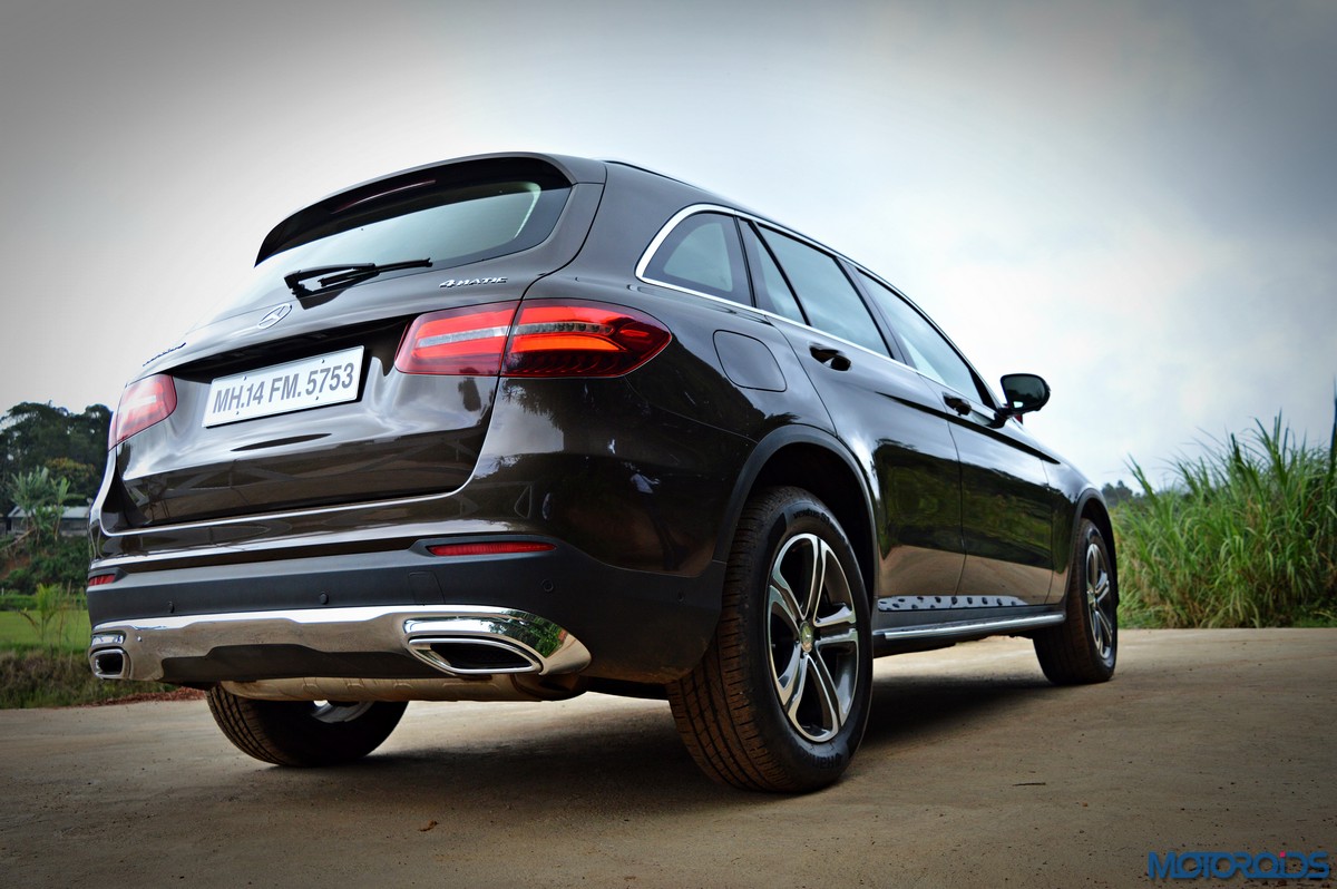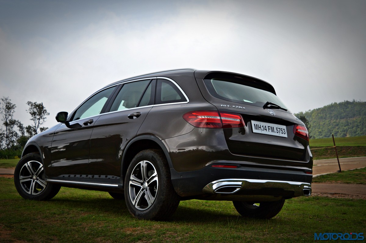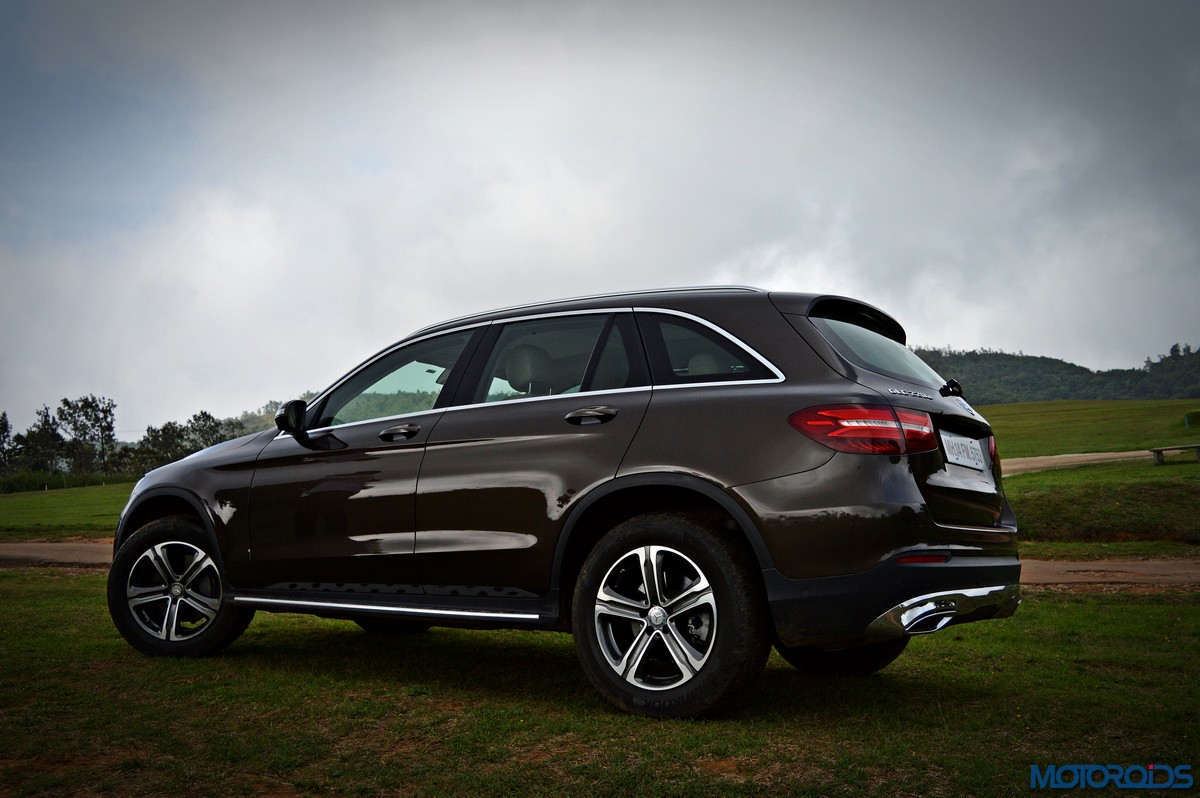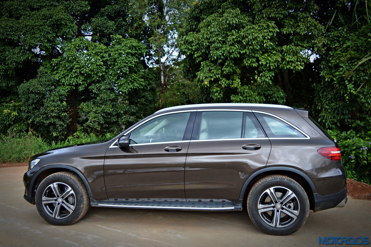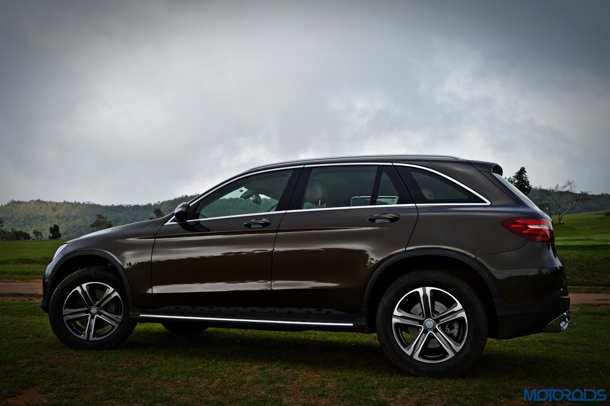 The side view showcases the almost coupé-like greenhouse with chrome beltline trim, while the familiar slashes on the doors and fenders visually link it to the C-Class. The wheelbase has been increased by 118 mm over its predecessor, the GLK, while aluminum-look running boards with rubber studs compliment the slim wheel-arch cladding. Destined for India models will ride on 18-inch, five-spoke light alloy wheels that look the part.