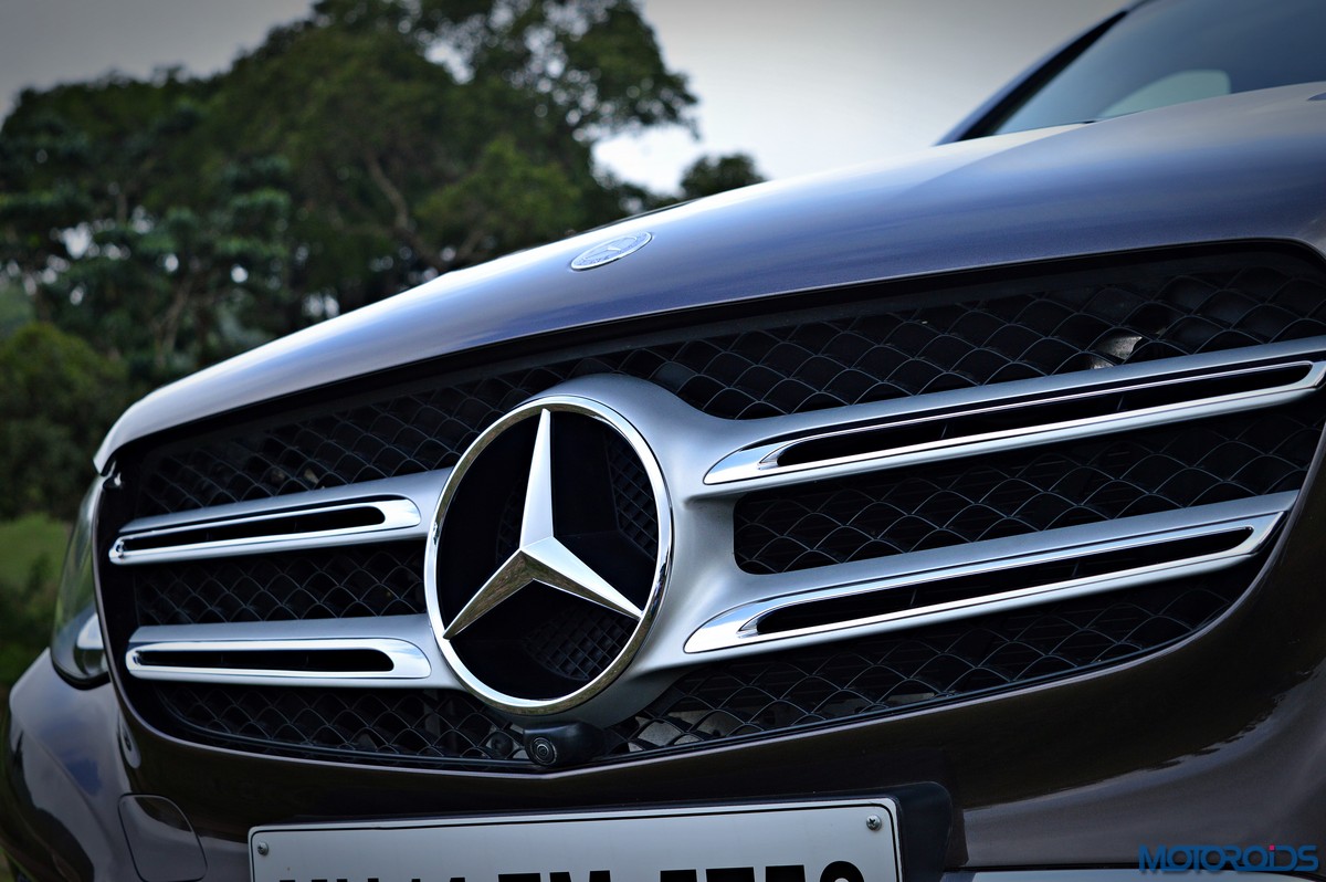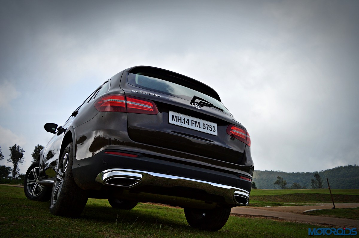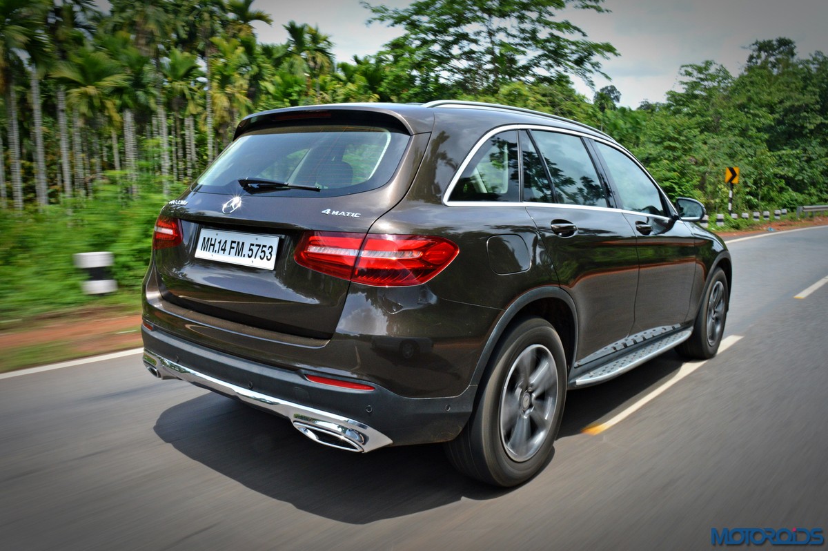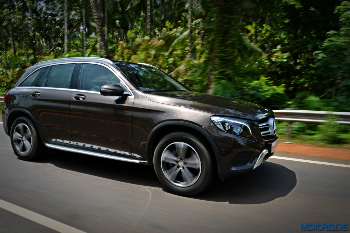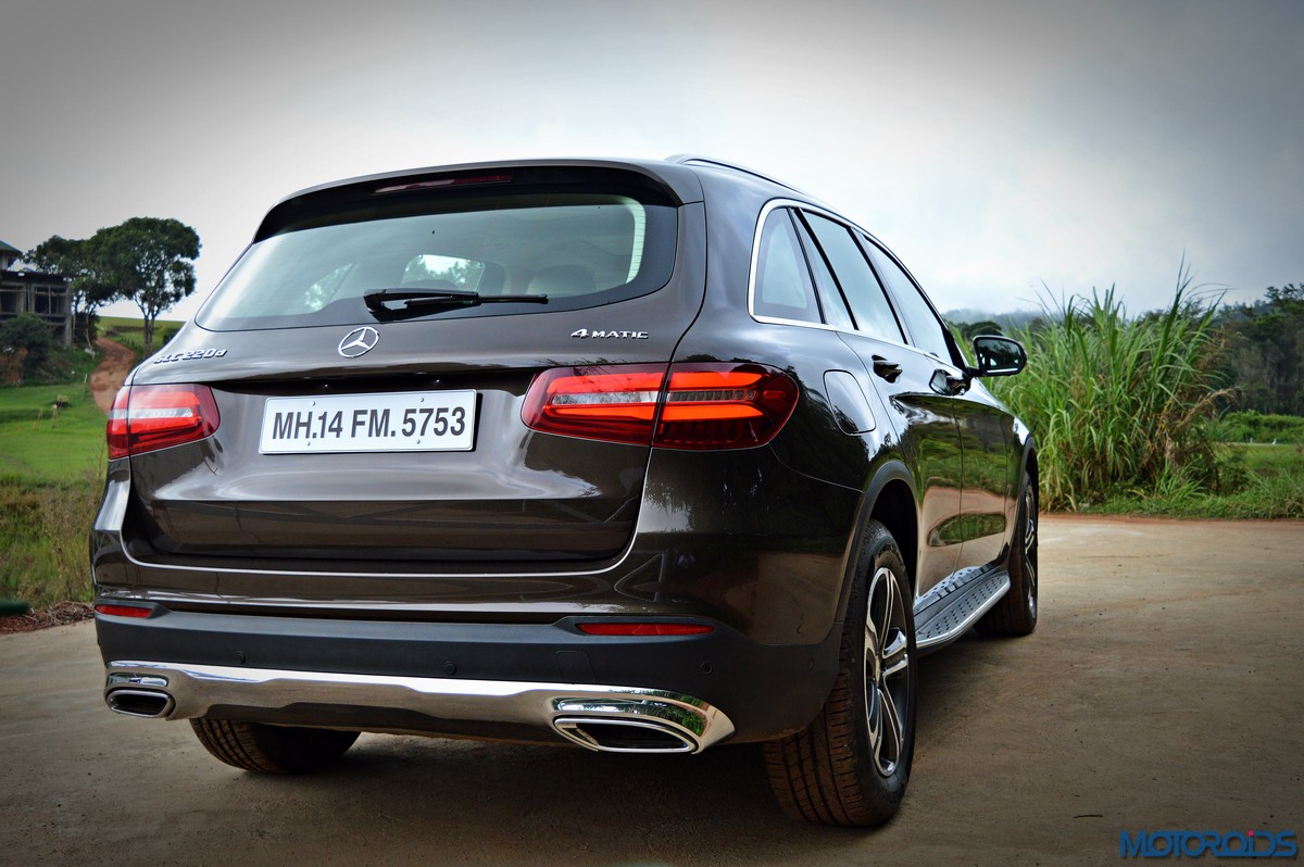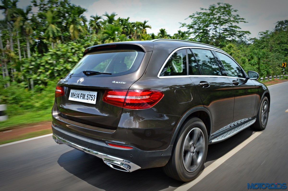 The side view showcases the almost coupé-like greenhouse with chrome beltline trim, while the familiar slashes on the doors and fenders visually link it to the C-Class. The wheelbase has been increased by 118 mm over its predecessor, the GLK, while aluminum-look running boards with rubber studs compliment the slim wheel-arch cladding. Destined for India models will ride on 18-inch, five-spoke light alloy wheels that look the part.