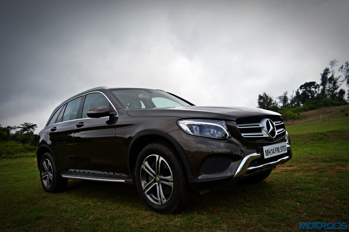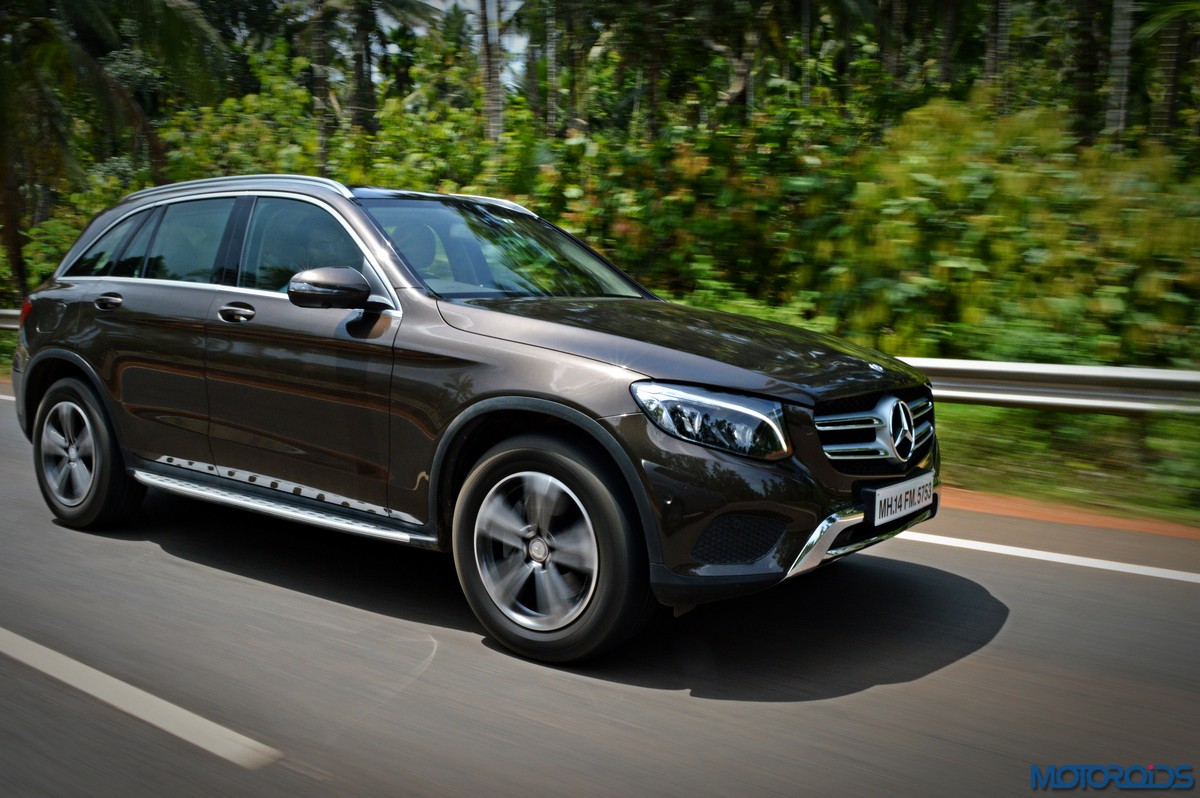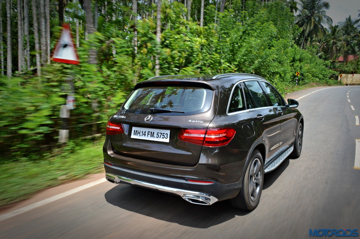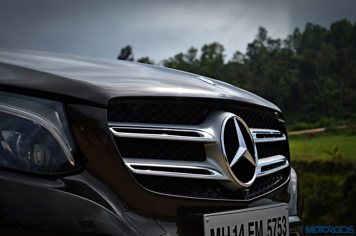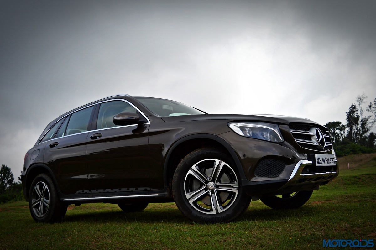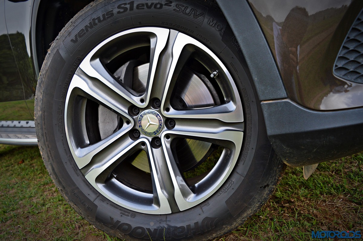 The side view showcases the almost coupé-like greenhouse with chrome beltline trim, while the familiar slashes on the doors and fenders visually link it to the C-Class. The wheelbase has been increased by 118 mm over its predecessor, the GLK, while aluminum-look running boards with rubber studs compliment the slim wheel-arch cladding. Destined for India models will ride on 18-inch, five-spoke light alloy wheels that look the part.
