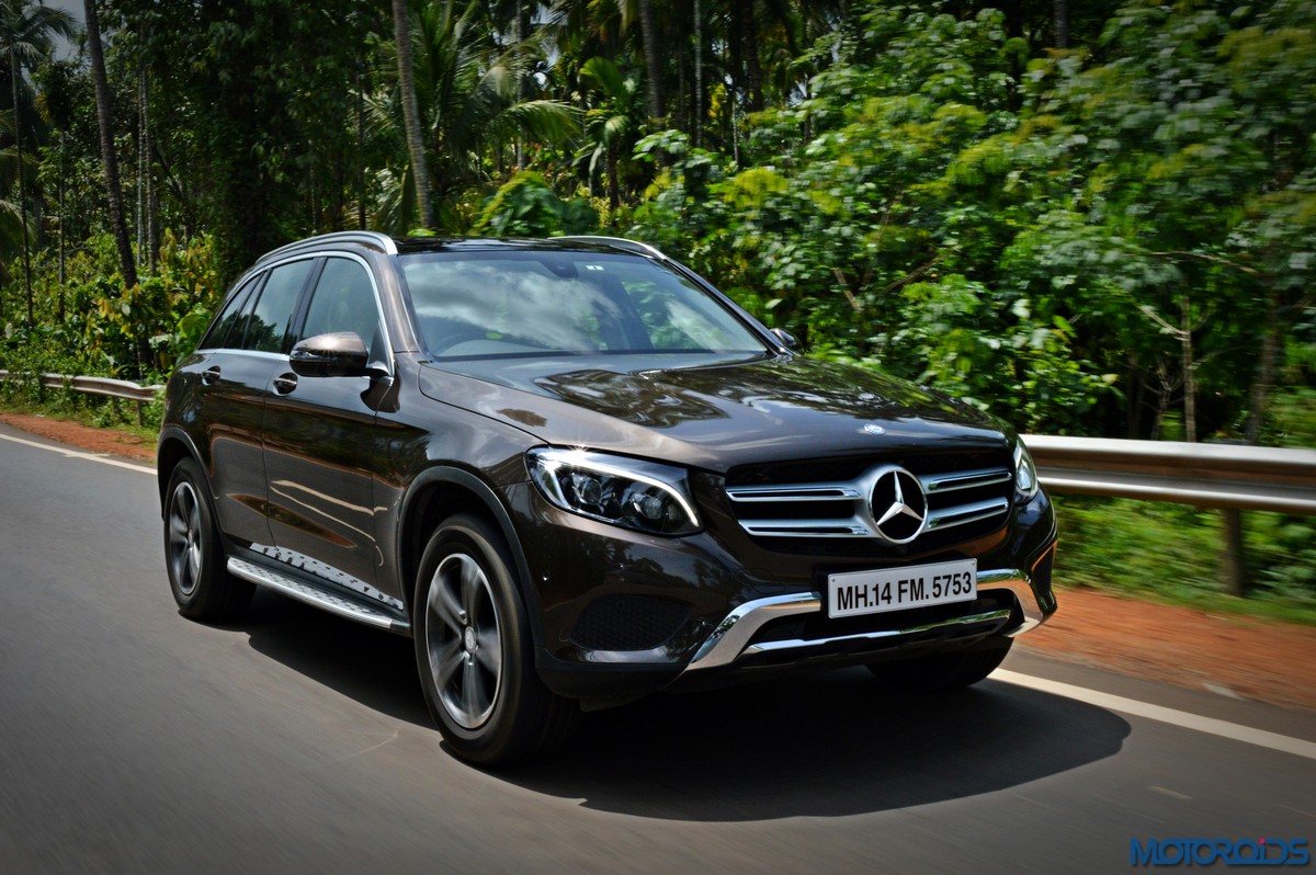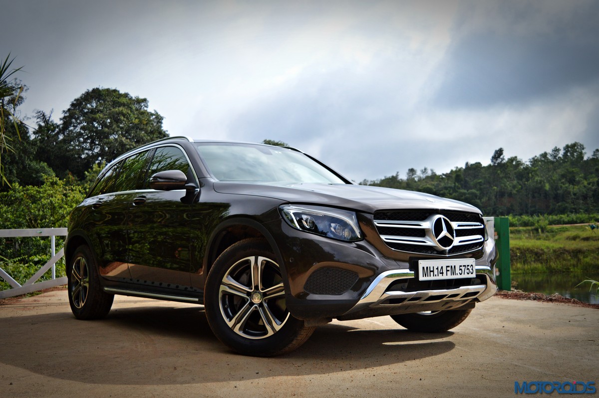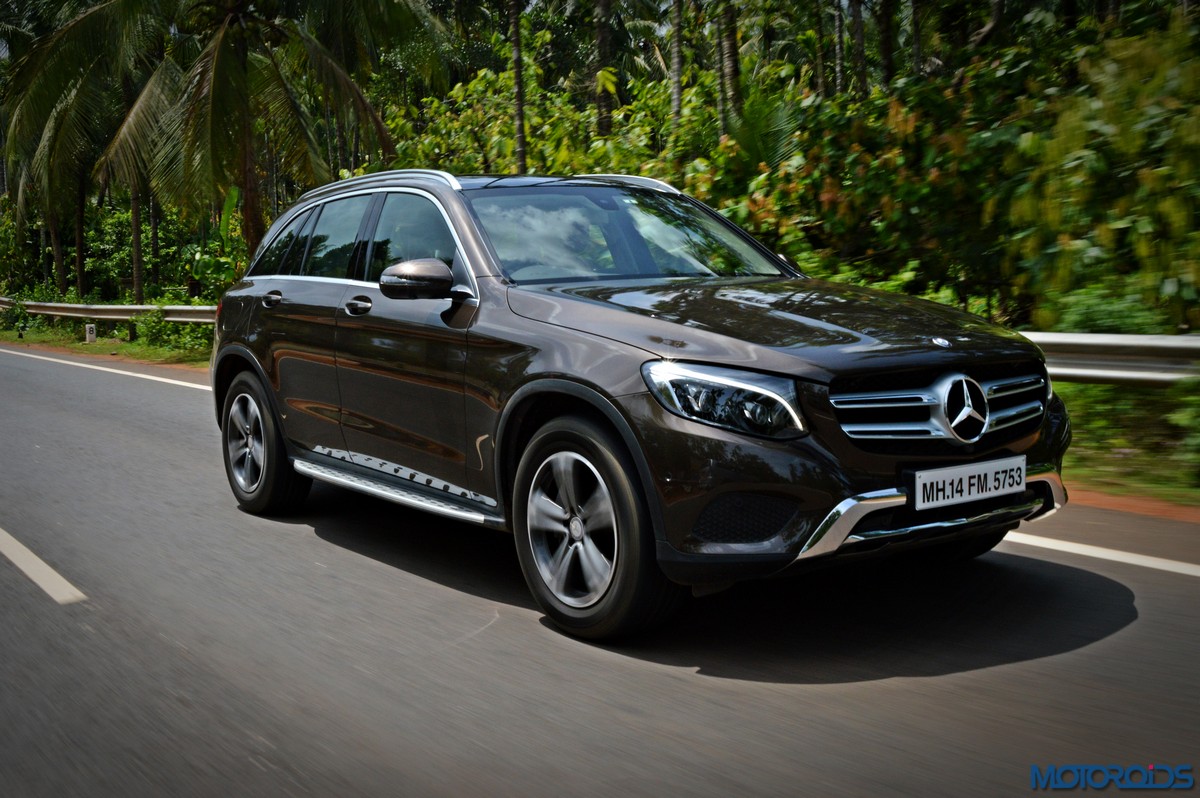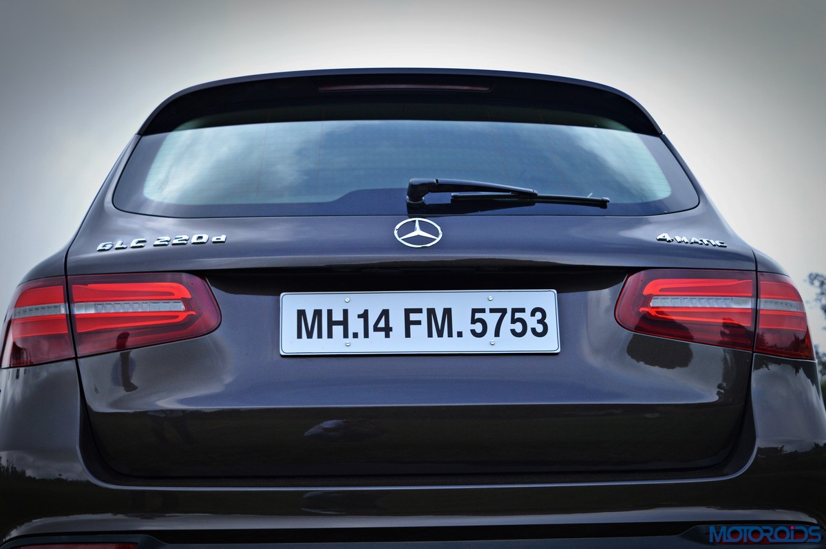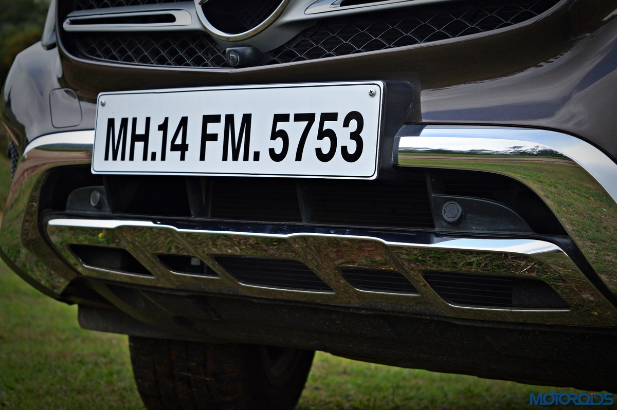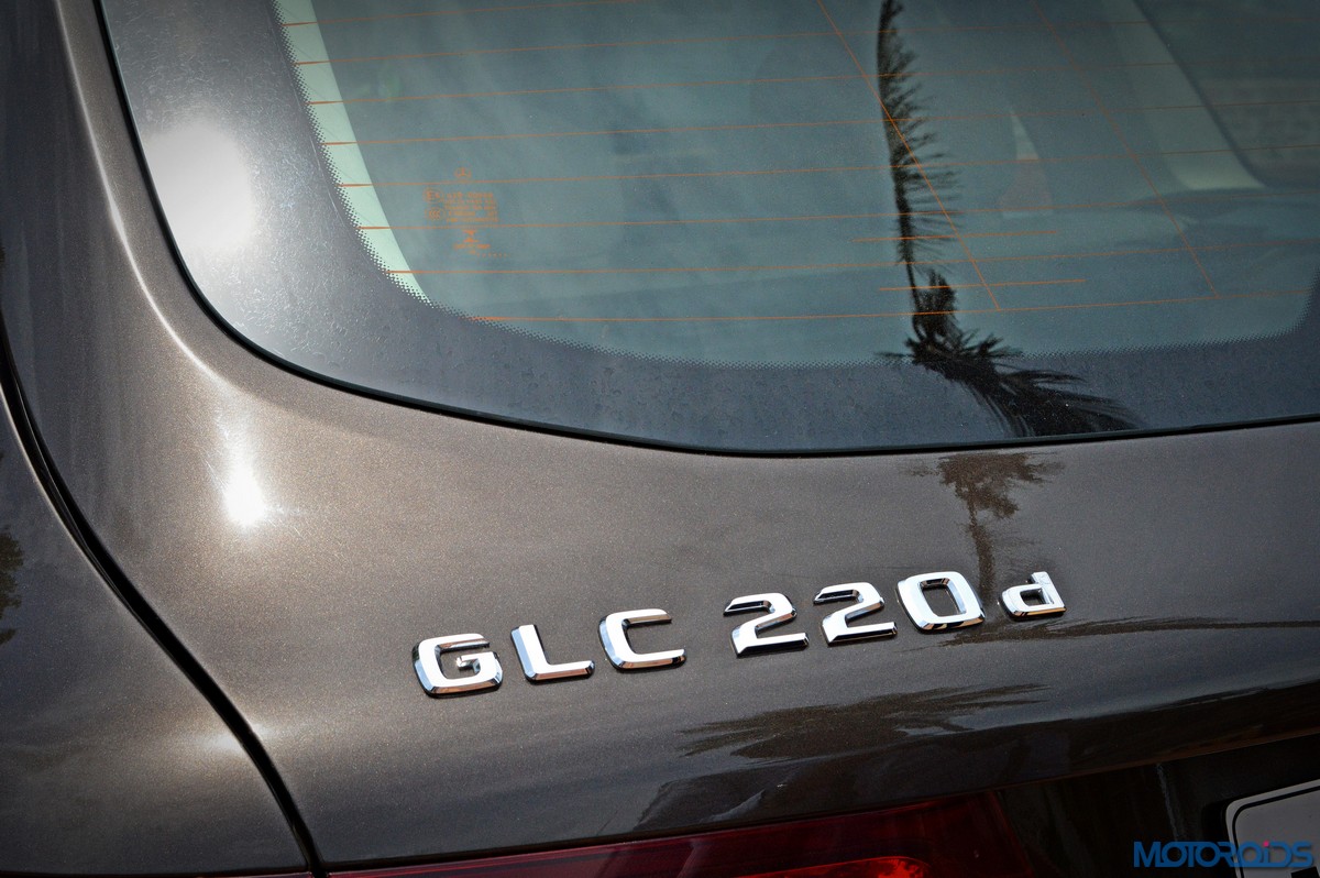 The side view showcases the almost coupé-like greenhouse with chrome beltline trim, while the familiar slashes on the doors and fenders visually link it to the C-Class. The wheelbase has been increased by 118 mm over its predecessor, the GLK, while aluminum-look running boards with rubber studs compliment the slim wheel-arch cladding. Destined for India models will ride on 18-inch, five-spoke light alloy wheels that look the part.