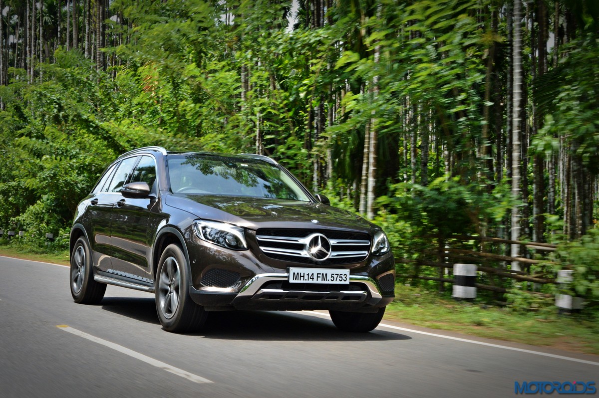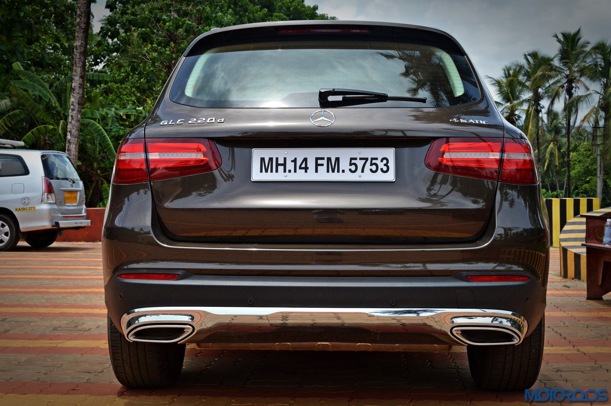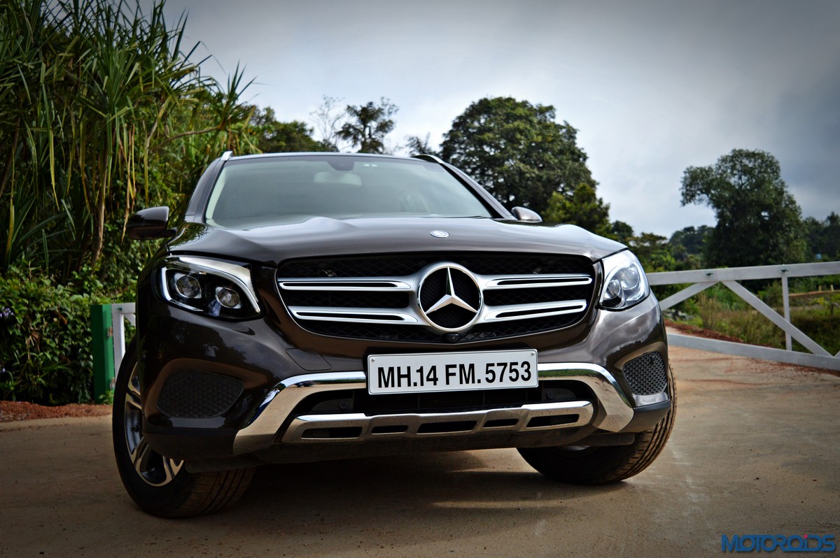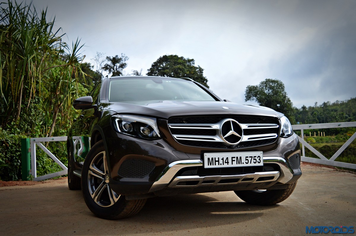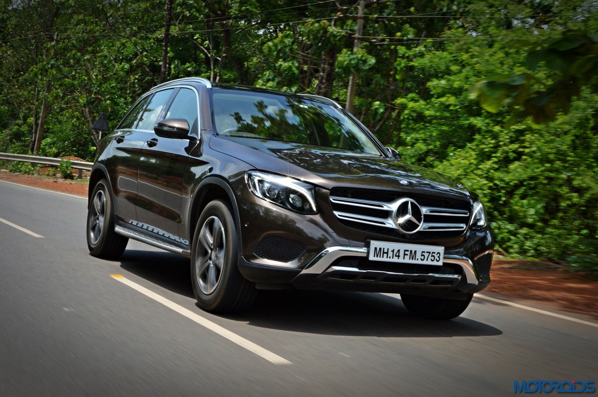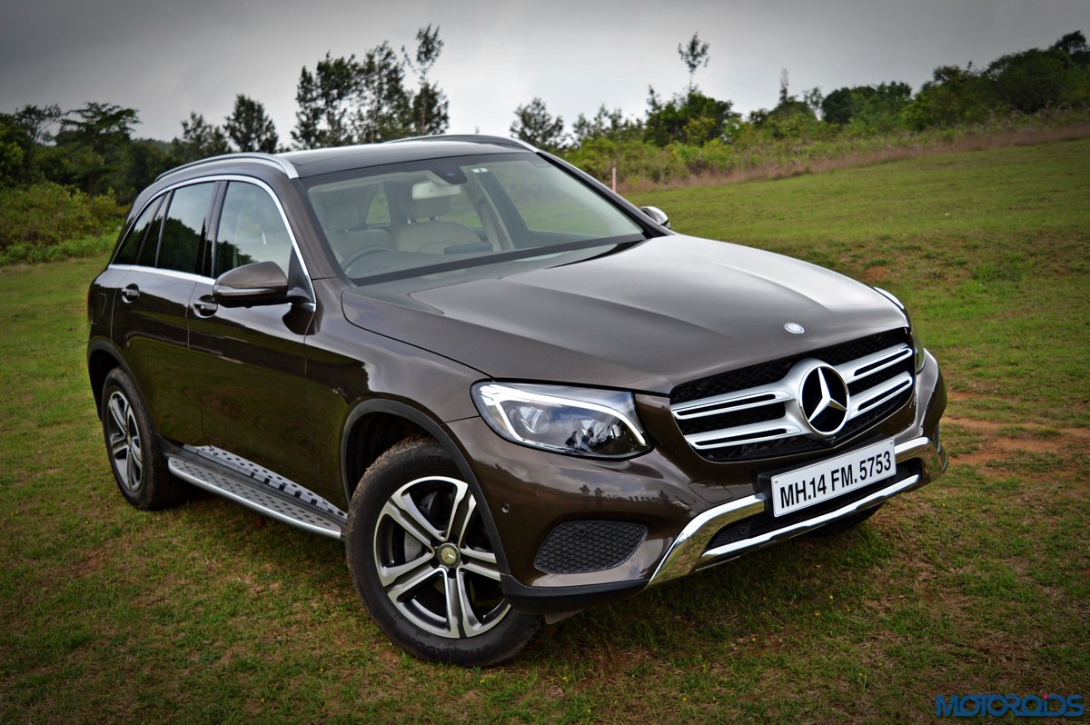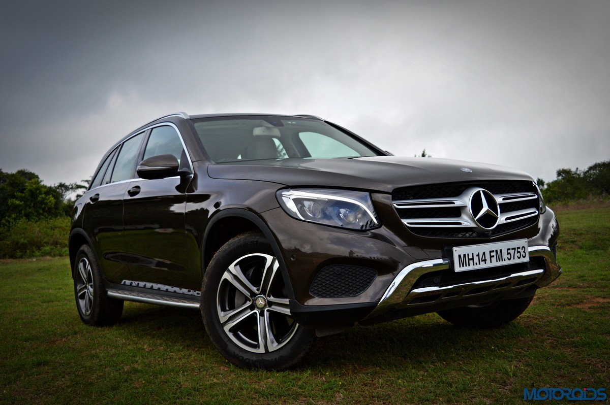 The side view showcases the almost coupé-like greenhouse with chrome beltline trim, while the familiar slashes on the doors and fenders visually link it to the C-Class. The wheelbase has been increased by 118 mm over its predecessor, the GLK, while aluminum-look running boards with rubber studs compliment the slim wheel-arch cladding. Destined for India models will ride on 18-inch, five-spoke light alloy wheels that look the part.