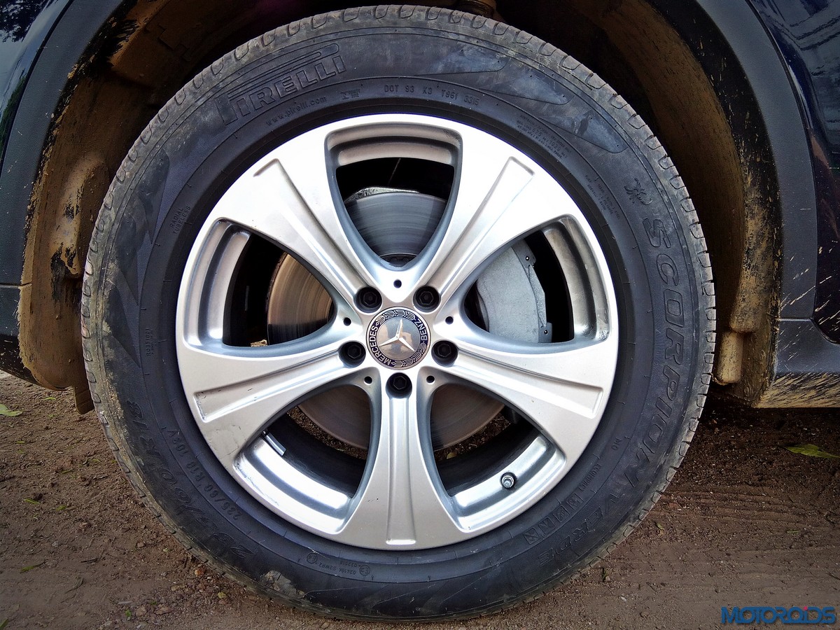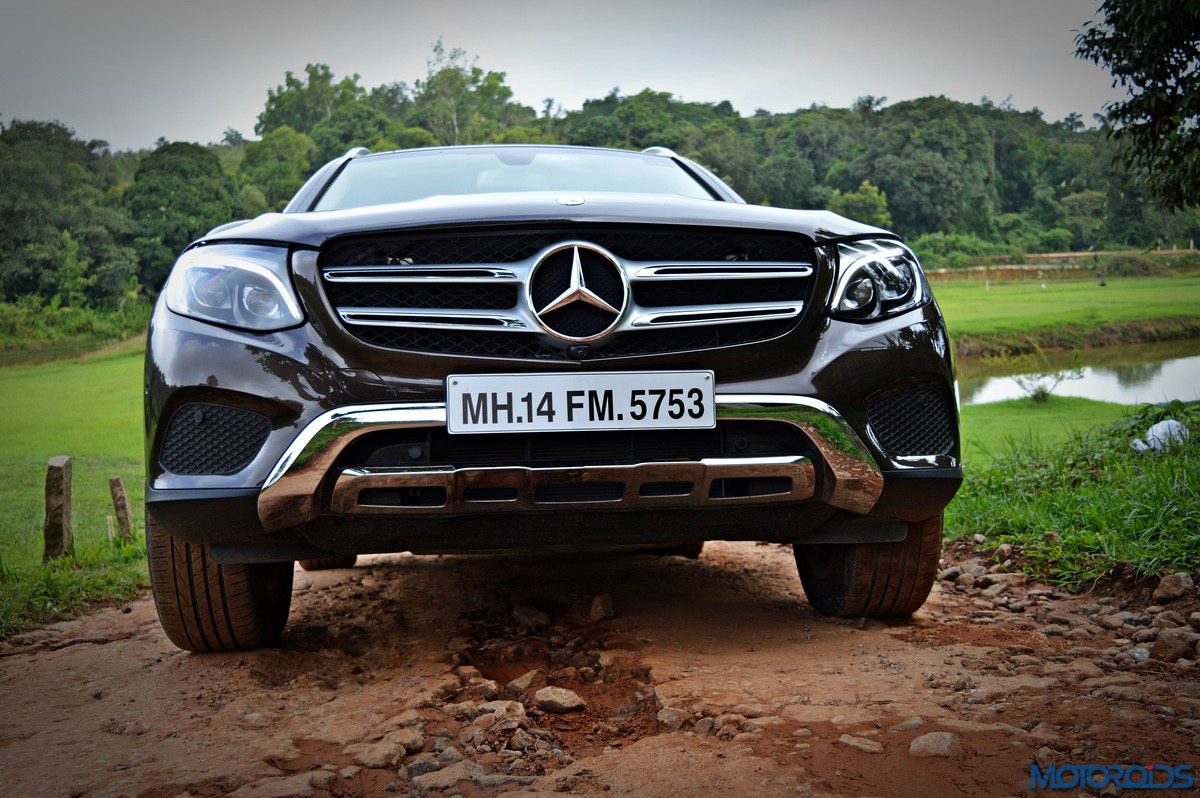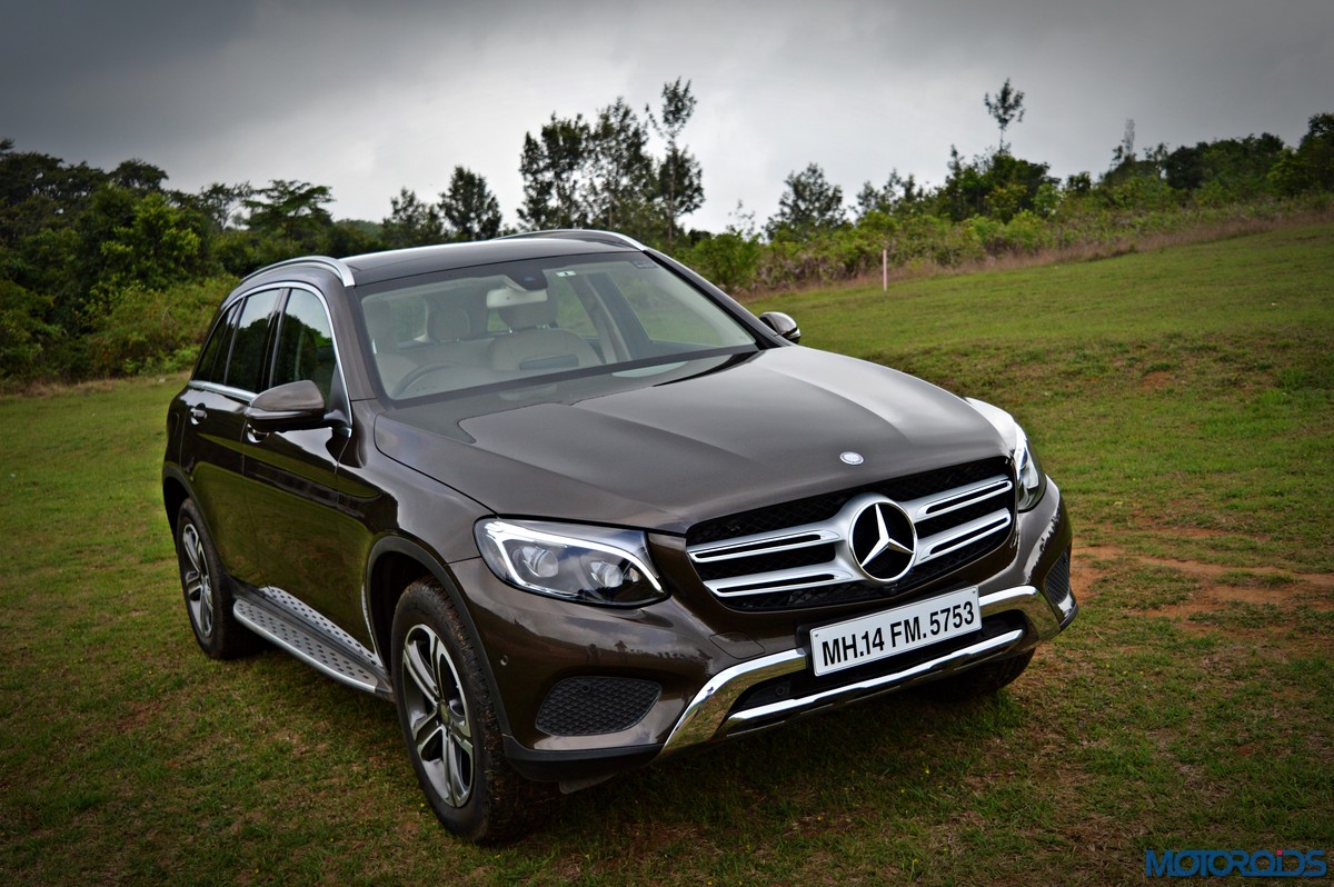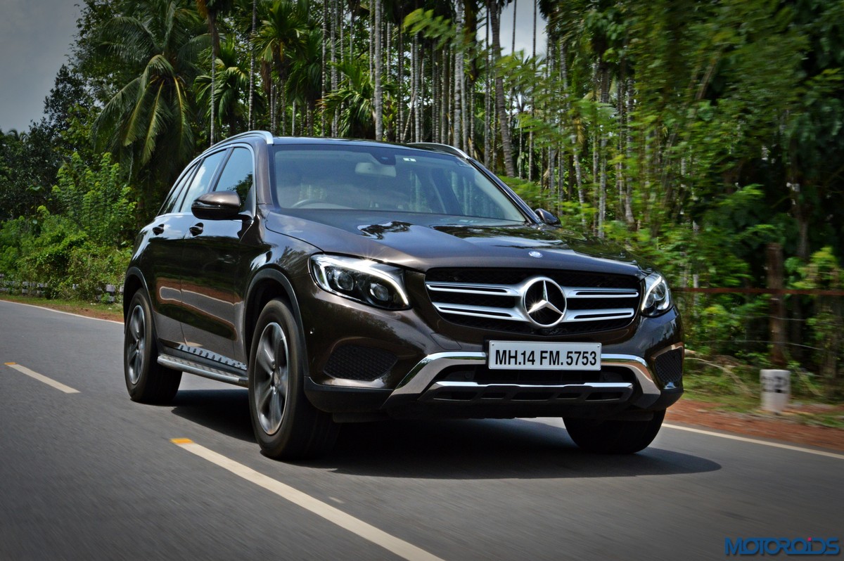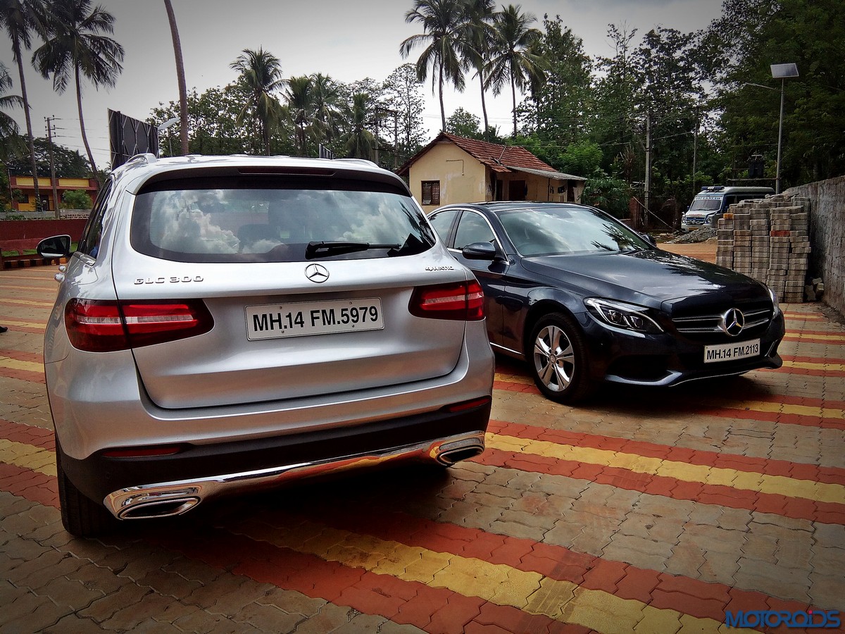 The side view showcases the almost coupé-like greenhouse with chrome beltline trim, while the familiar slashes on the doors and fenders visually link it to the C-Class. The wheelbase has been increased by 118 mm over its predecessor, the GLK, while aluminum-look running boards with rubber studs compliment the slim wheel-arch cladding. Destined for India models will ride on 18-inch, five-spoke light alloy wheels that look the part.