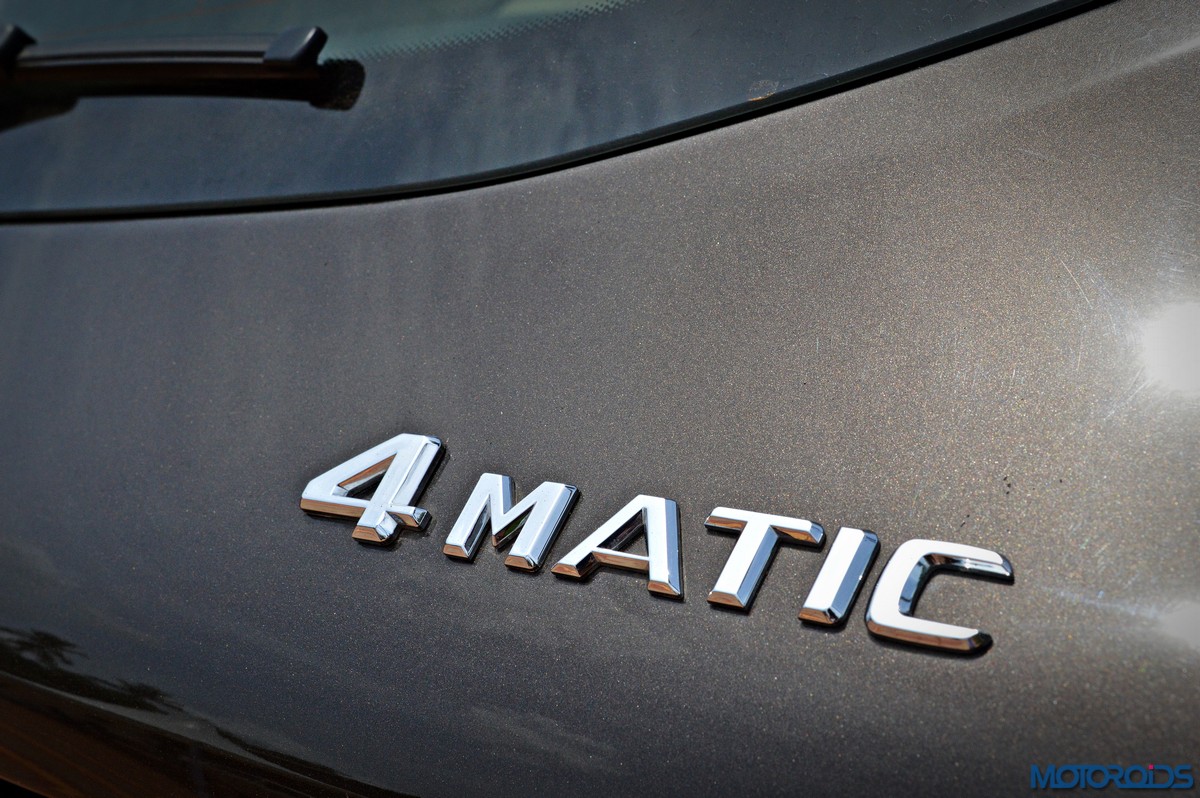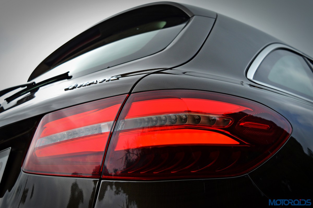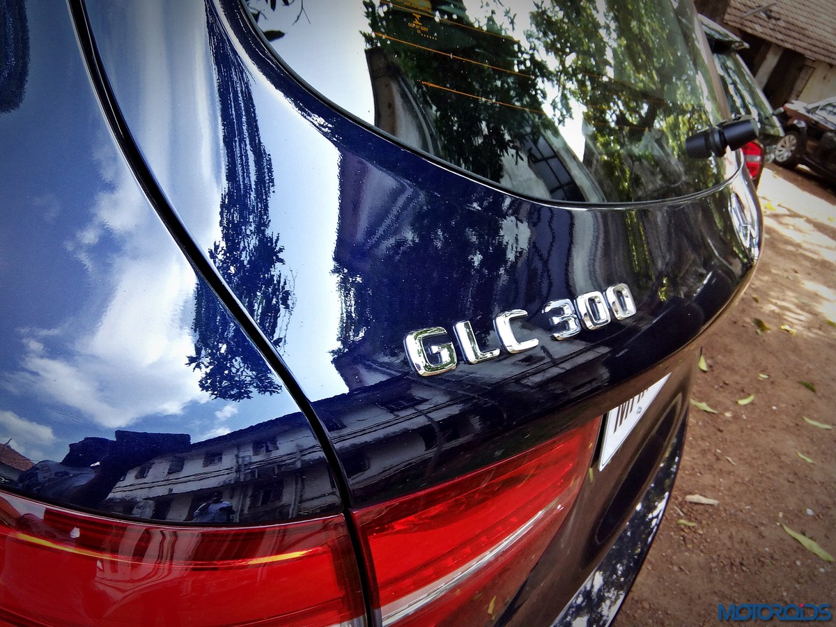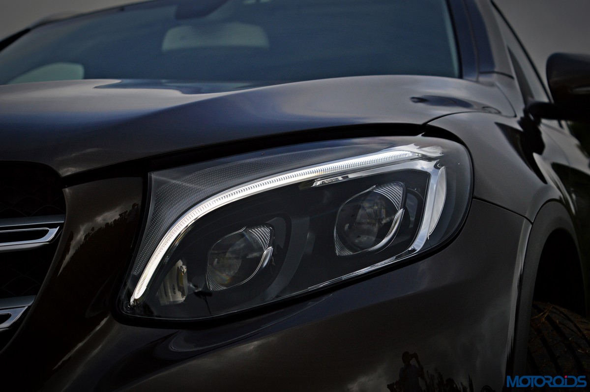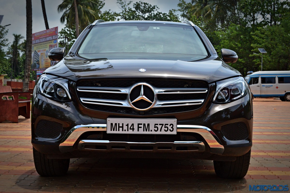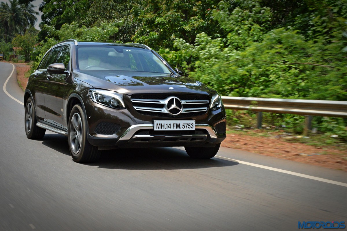 The side view showcases the almost coupé-like greenhouse with chrome beltline trim, while the familiar slashes on the doors and fenders visually link it to the C-Class. The wheelbase has been increased by 118 mm over its predecessor, the GLK, while aluminum-look running boards with rubber studs compliment the slim wheel-arch cladding. Destined for India models will ride on 18-inch, five-spoke light alloy wheels that look the part.