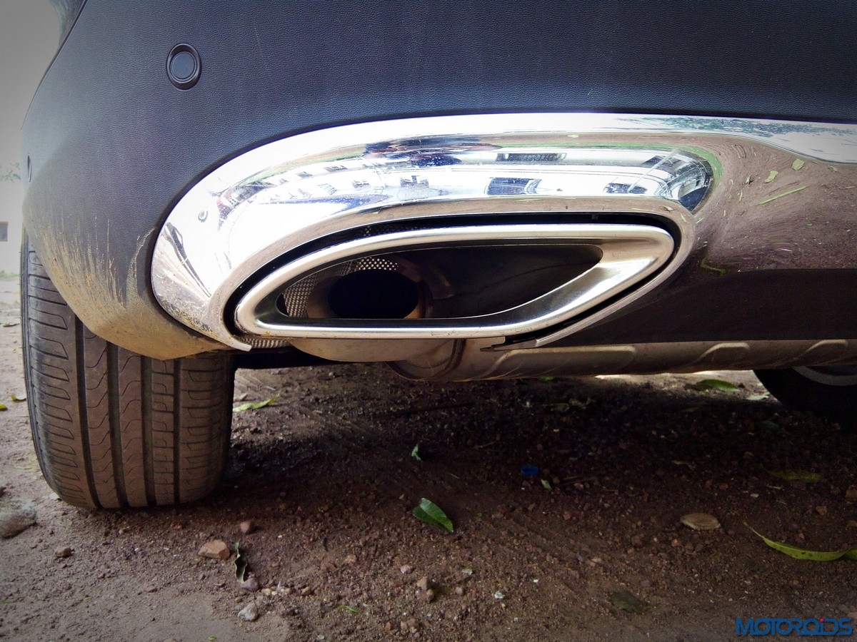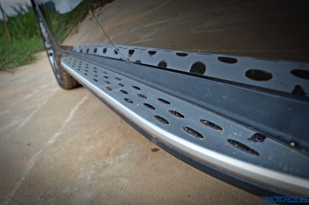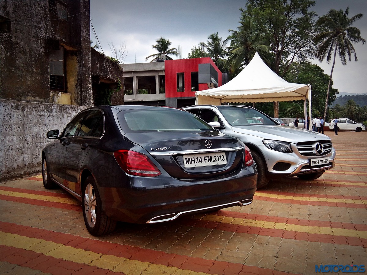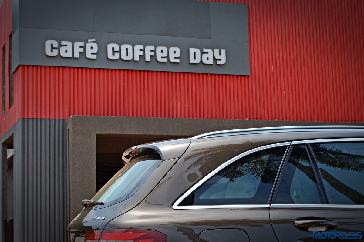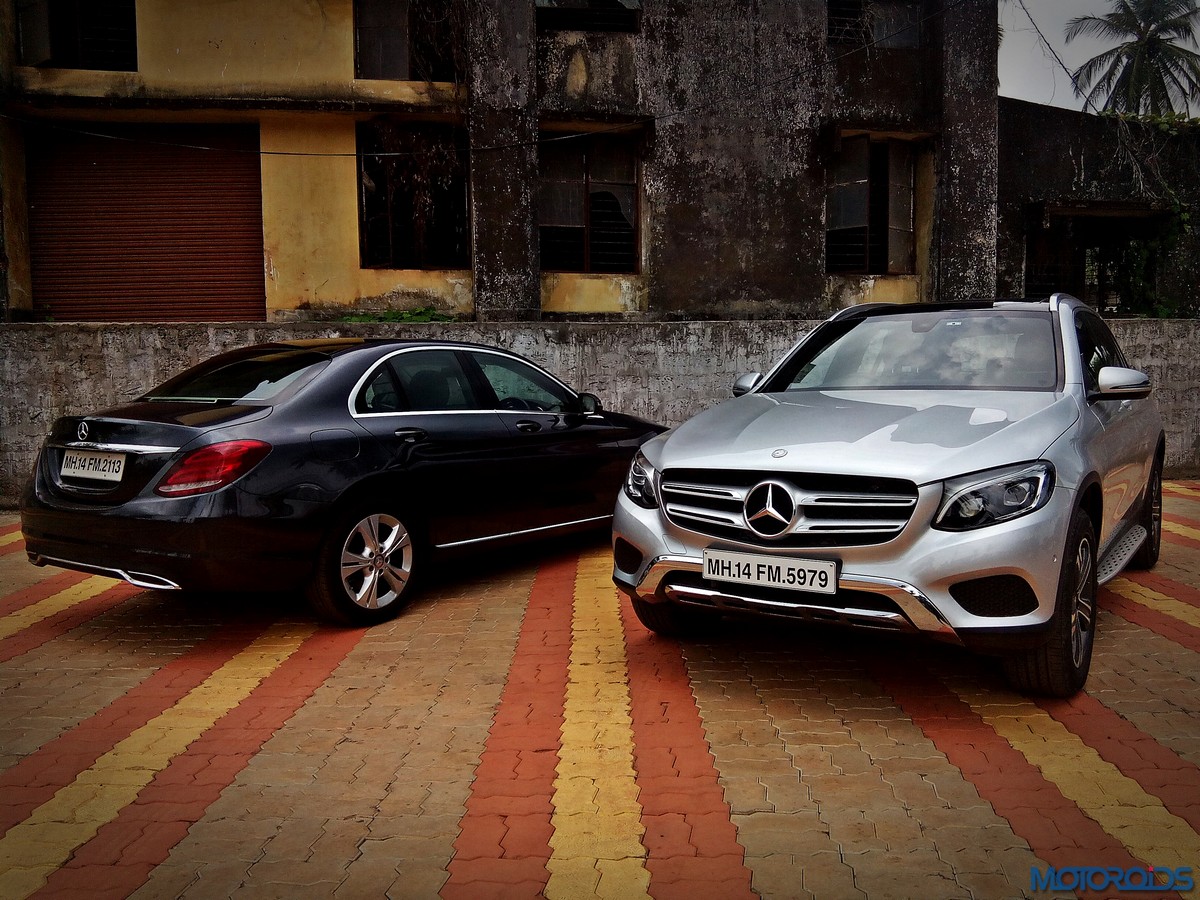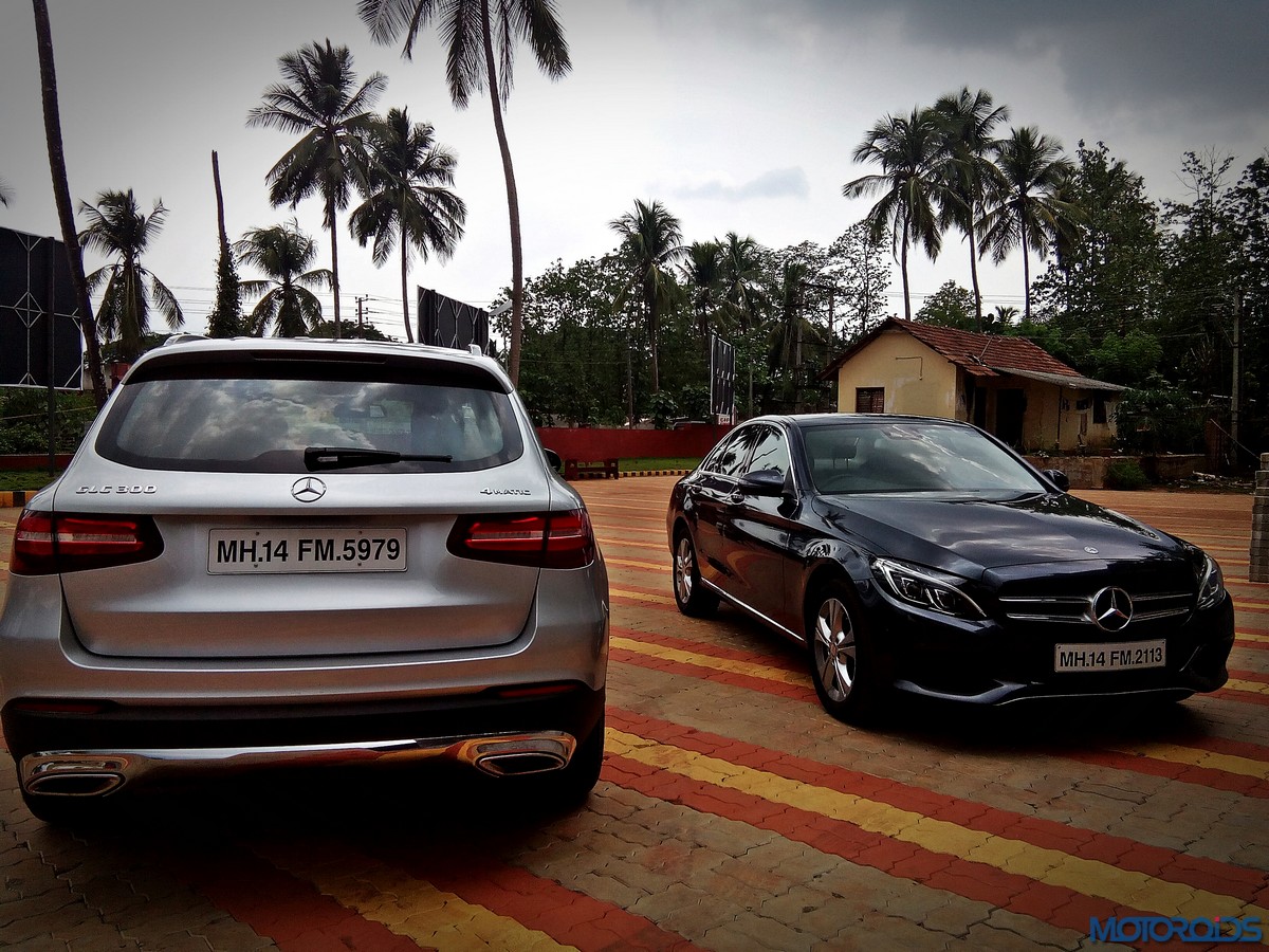 The side view showcases the almost coupé-like greenhouse with chrome beltline trim, while the familiar slashes on the doors and fenders visually link it to the C-Class. The wheelbase has been increased by 118 mm over its predecessor, the GLK, while aluminum-look running boards with rubber studs compliment the slim wheel-arch cladding. Destined for India models will ride on 18-inch, five-spoke light alloy wheels that look the part.