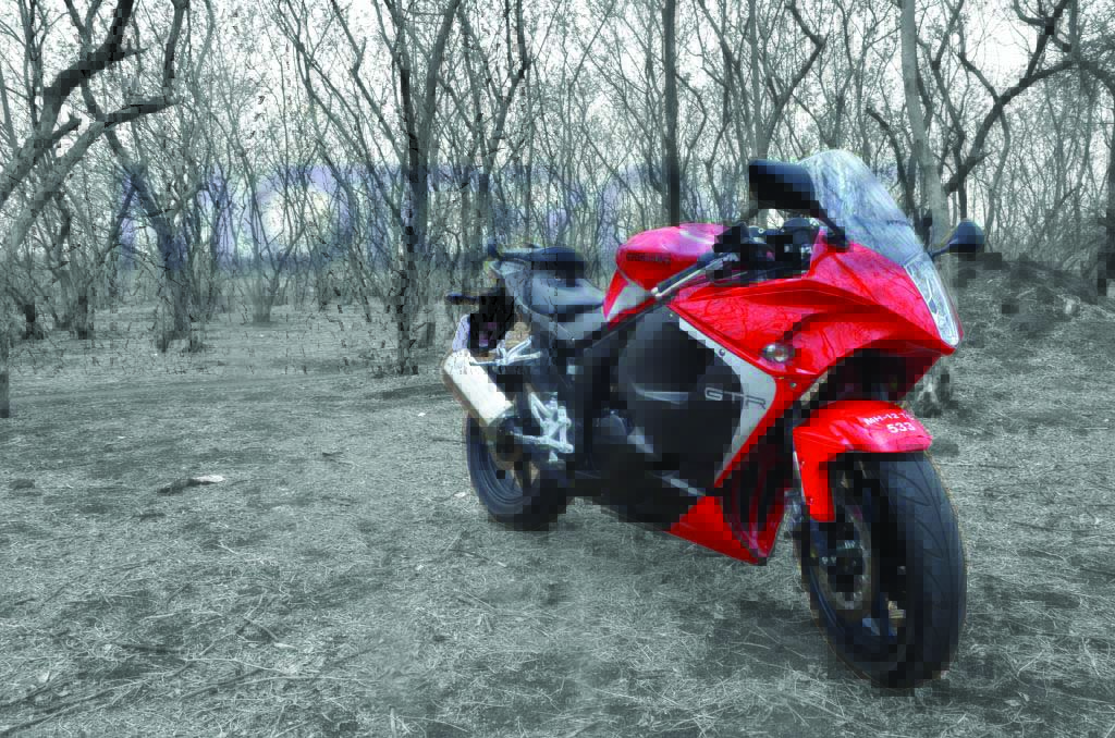 Moving to the sides, the rather bland surfaces of the front fascia are replaced by some well defined creases and air scoops. The GT250R’s front fairing also consists of blinkers and some neat contrasting graphics, along with the words “GTR” inked on them. In front three-quarter view, this bike manages to impress with its neatly crafted front fairing, along with the wide tyre and twin disc front discs, which seem to have been pilfered from a litre class machine! The bike’s massive fuel tank boasts of some interesting surfaces, all of which further help the rather well built GT250R to look sharp and sporty. The bike’s exposed perimeter frame element and that sharply styled rear section, along with those chunky grab rails, complete the bike’s profile.