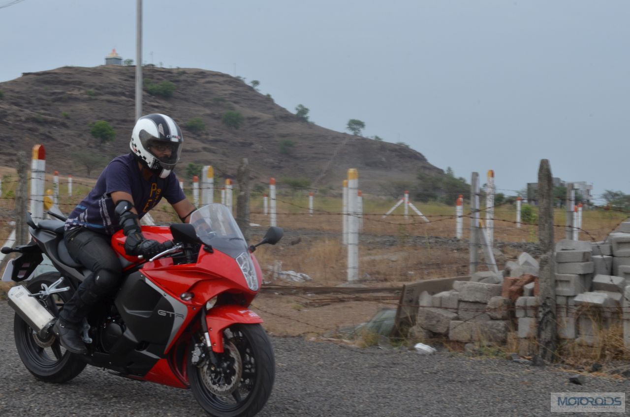 For the pillion though, it’s a different story altogether . The pillion foot pegs, in typical supersports fashion, are set considerably high and even the seat height is much more than that for the rider. Once seated, the pillion gets a clear view of the road ahead, what with him being perched much higher than the rider. The GT250R comes with chunky looking grab rails, whose shape reminds me of the ones on my TVS Apache RTR. It is fairly easy for the pillion to bend forward and secure himself by gripping the fuel tank.