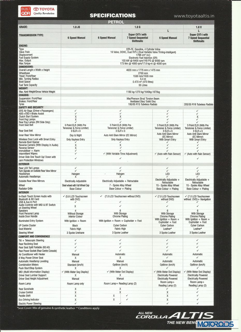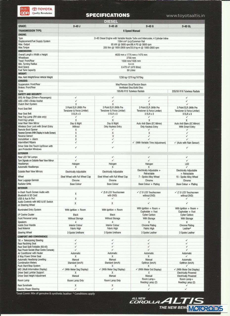 Variant wise chart of the new 2014 Toyota Corolla Altis’ features and specs is provided below (click on the images to expand)