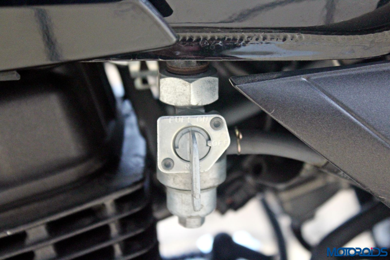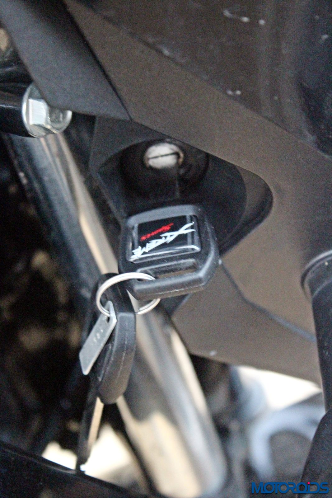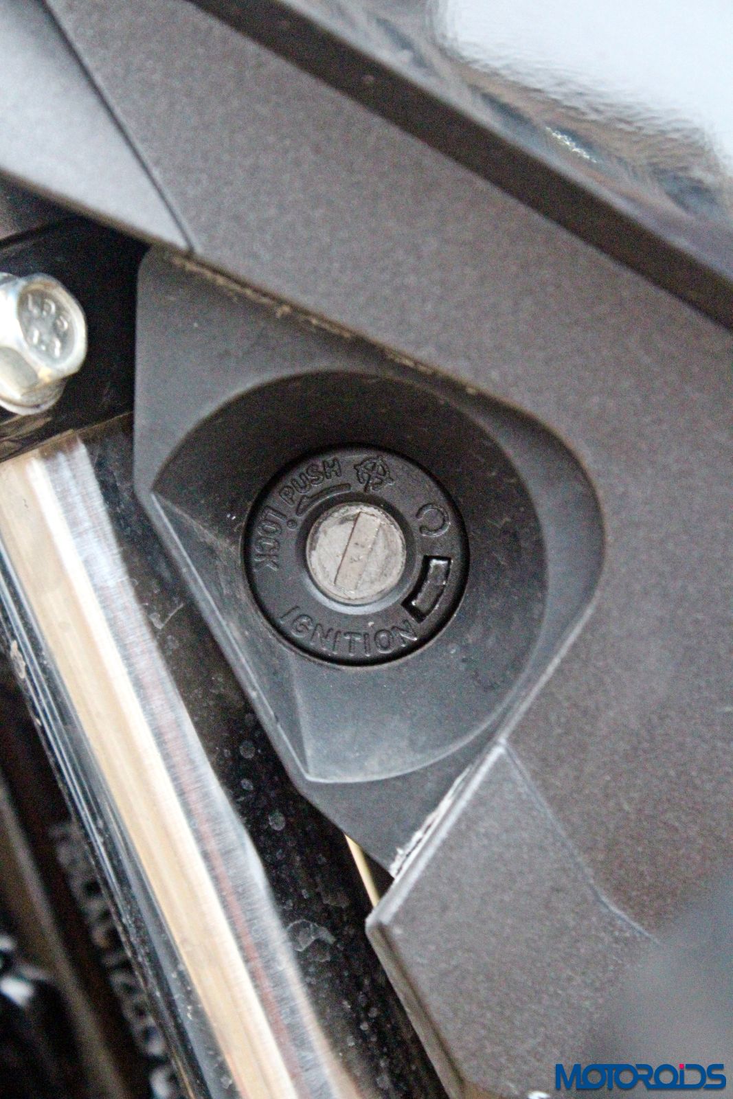 The keyhole is positioned on the right side of the fairing. Add to that the absence of engine kill switch and you may have a situation that would take a while to acquaint.