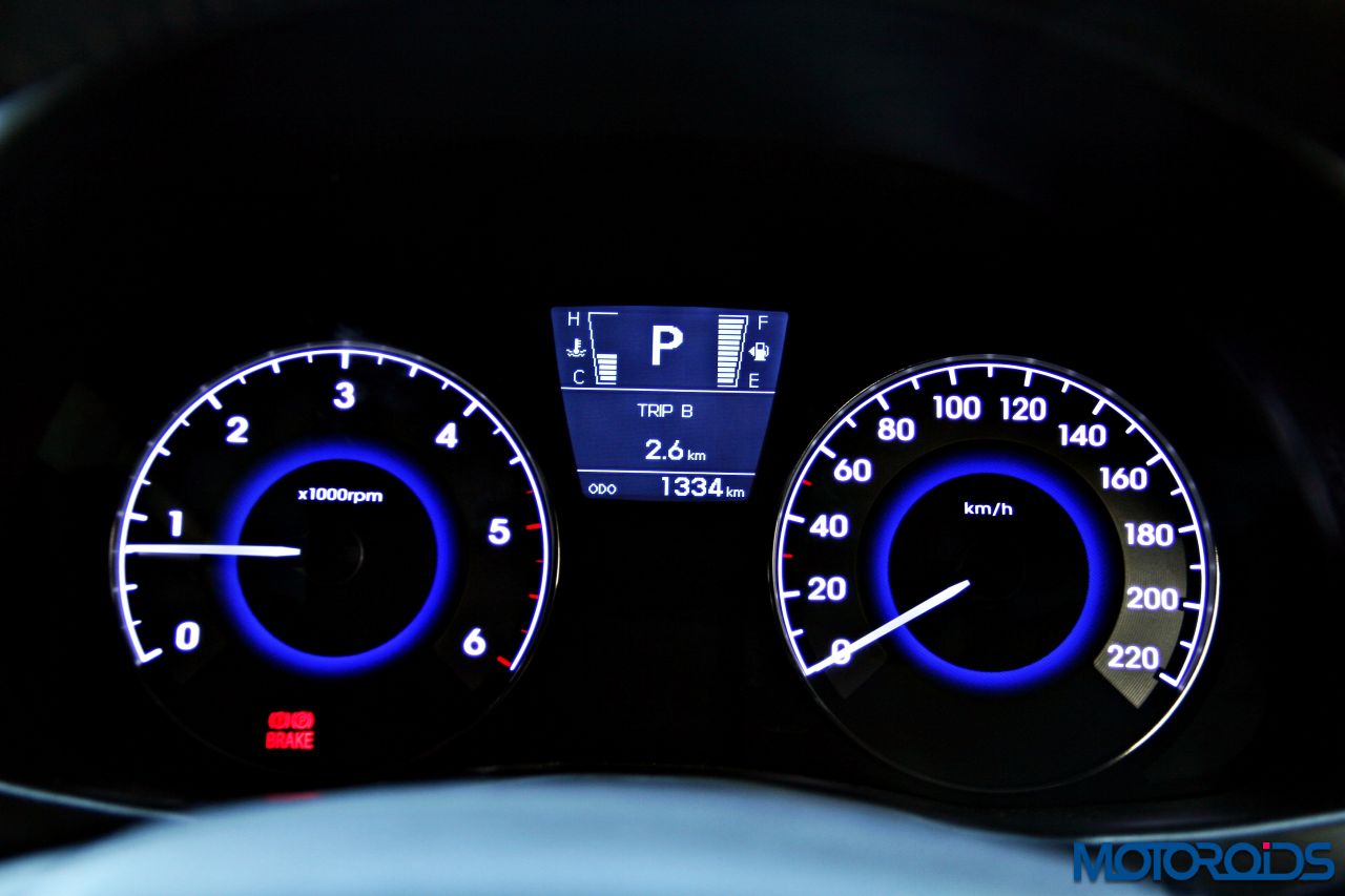 The Instrument cluster features two chrome ringed white dials which stay lit throughout. Needles are white too, pointing out from what appears as some moon eclipsing a blue lit Sun. The Multi-information display unit is located in the center and displays multitude of information, including a cell phone network bar type display for fuel levels and engine temperature, distance to empty, average fuel efficiency, instantaneous FE, external temperature, and the usual warning signs. It also displays eco mode status and recommends the right gear to upshift to, in order to extract maximum economy, while driving the manual variants.