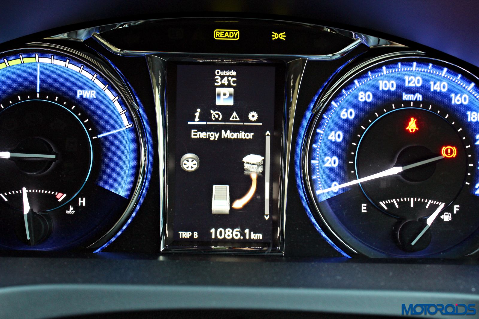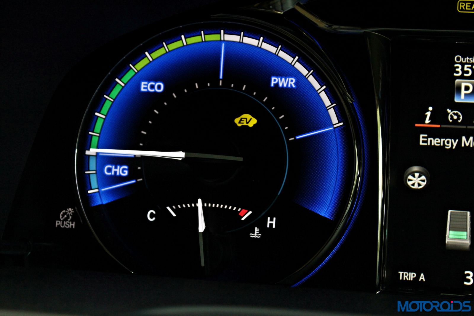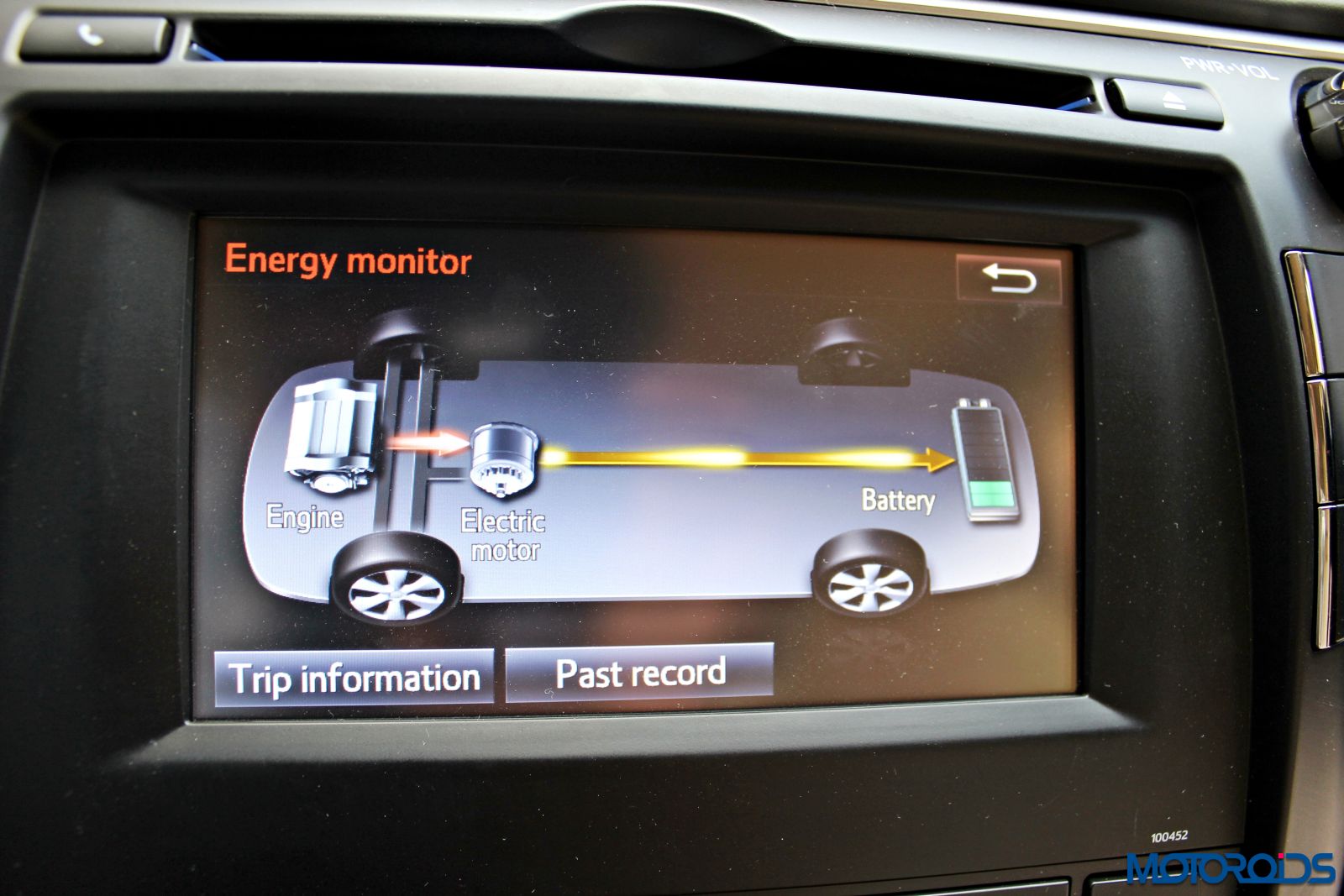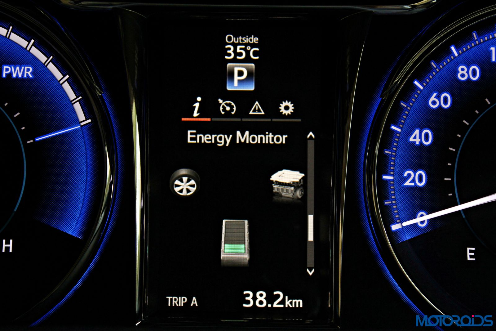 It displays the fancy energy monitor and all other vehicle parameters so that the driver doesn’t need to take his eyes too far off from the road.