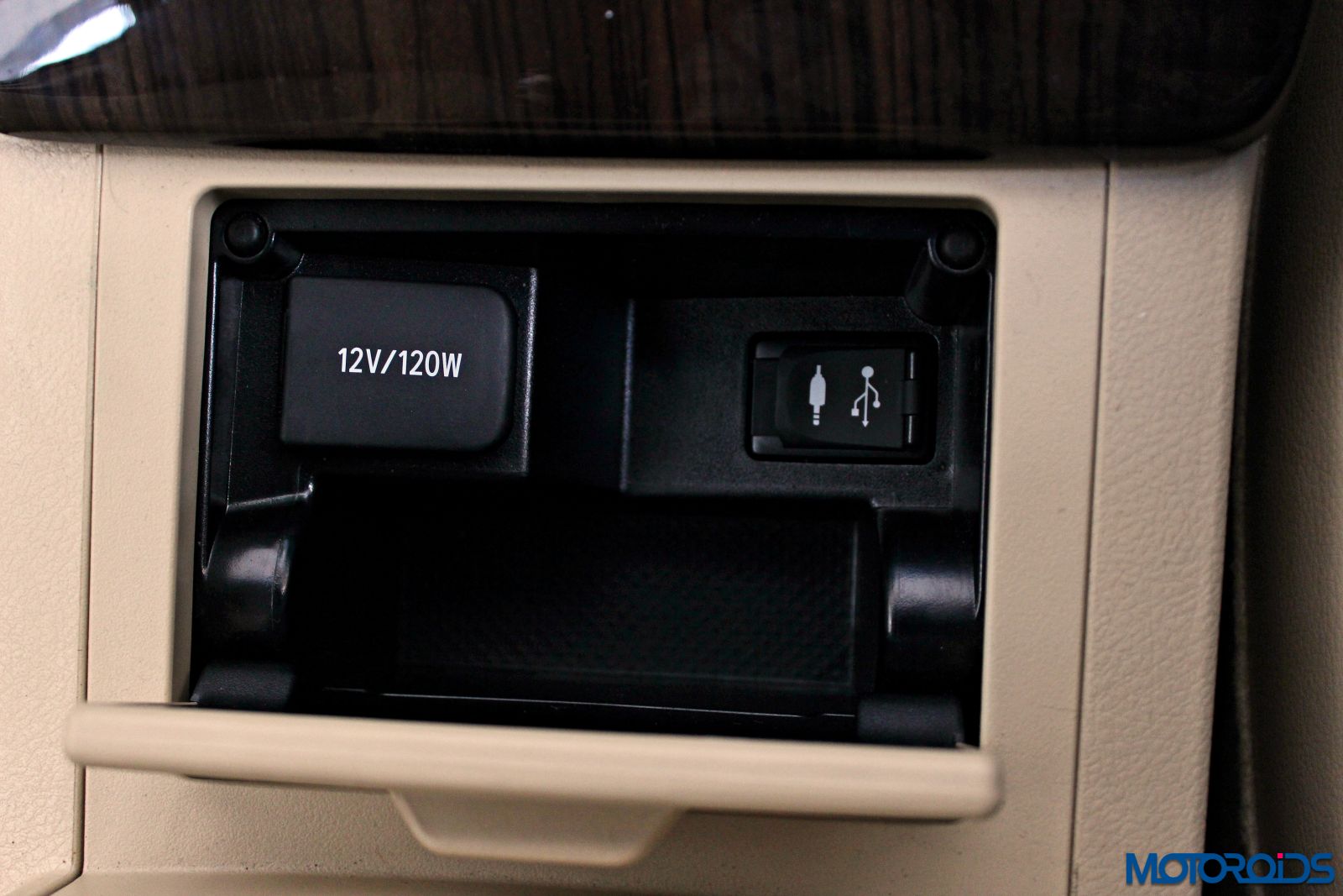 Power, aux-in and USB sockets are neatly hidden behind a door
