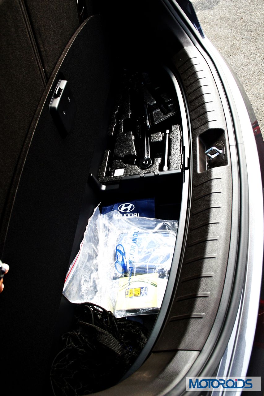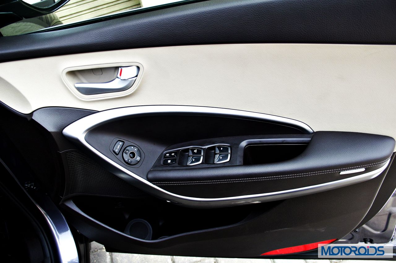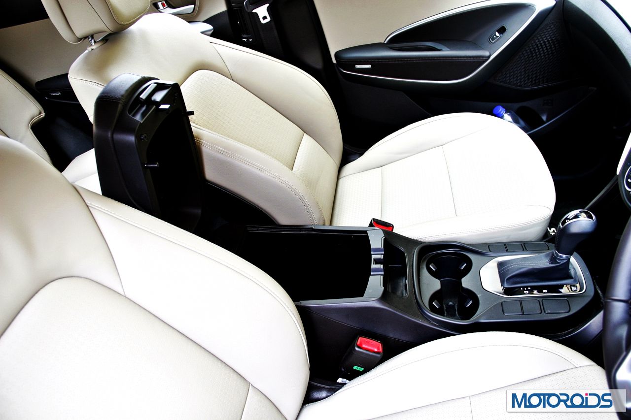 In terms of storage spaces, the Santa Fe scores highly with a practical mix of a variety of cubbyholes. The front doors have large map pockets with space for a big one-liter water bottle, more space for a smaller bottle and then some for flatter objects. The armrests on doors also have a small cranny where a small cellphone could rest happily. The front central armrest comes with a flip-open lid, and offers really generous space beneath. To give you an idea about its volume, it swallowed two digital SLRs comfortably. Between the top lid and the big hollow under the armrest, you have a shallow plastic tray which can handle stuff like your wallet or cell-phone.