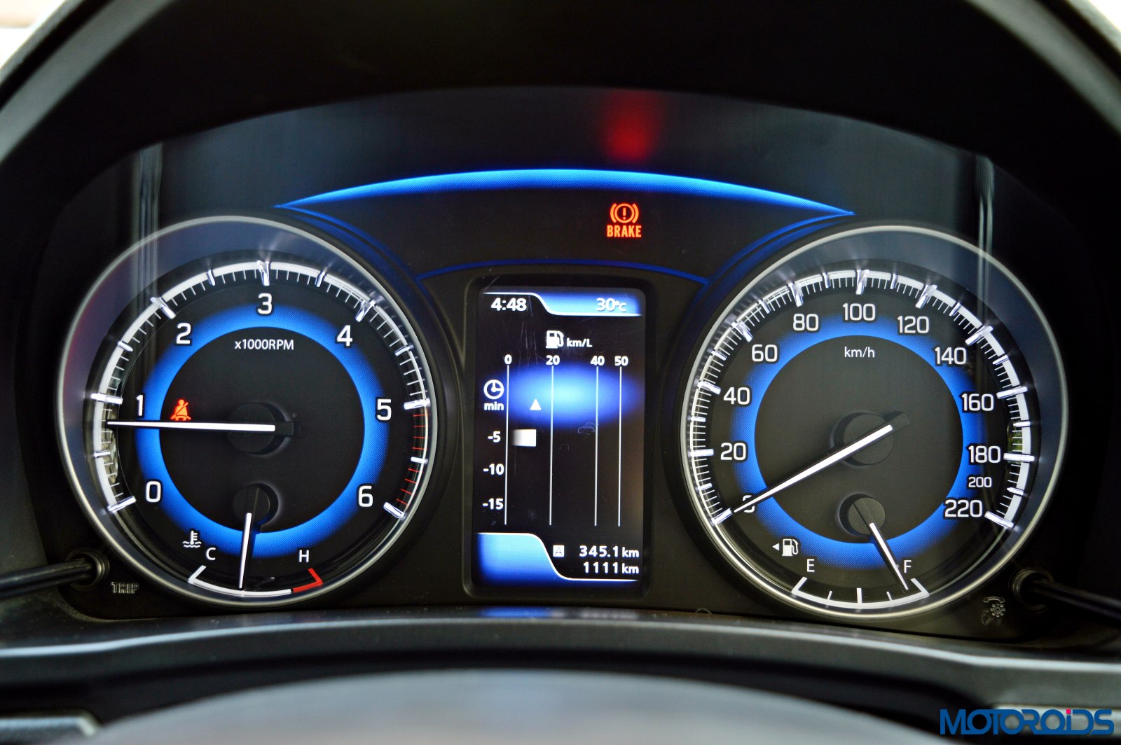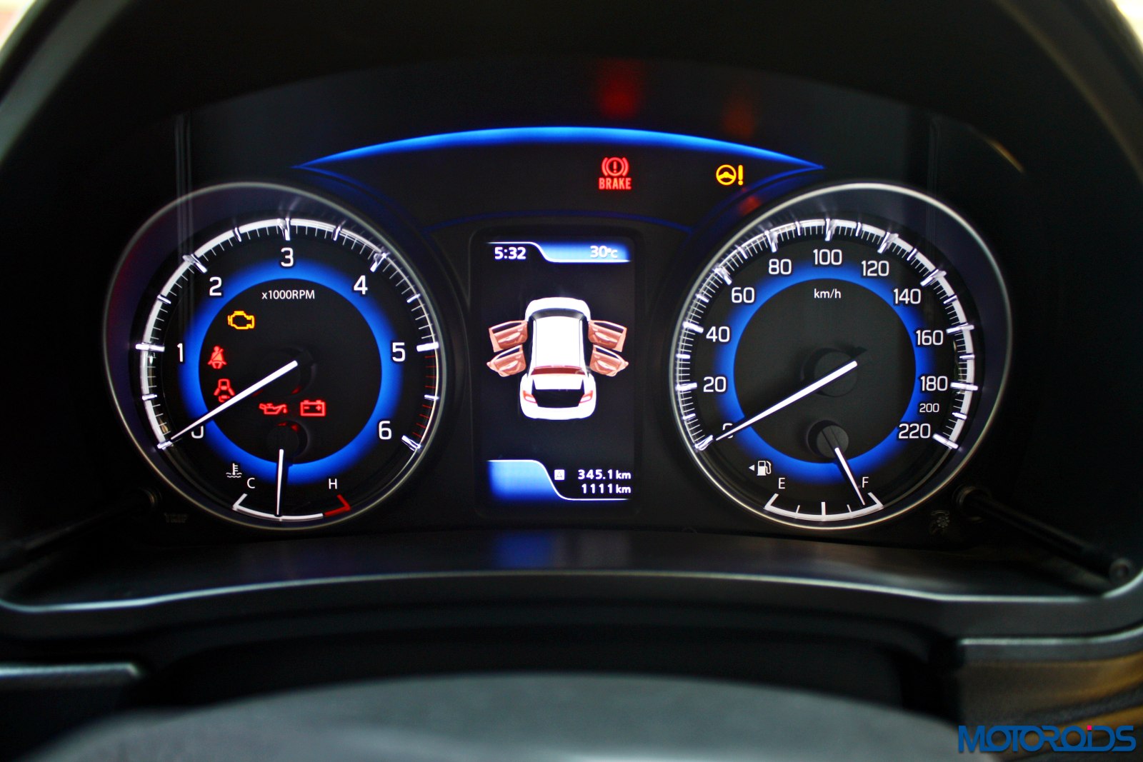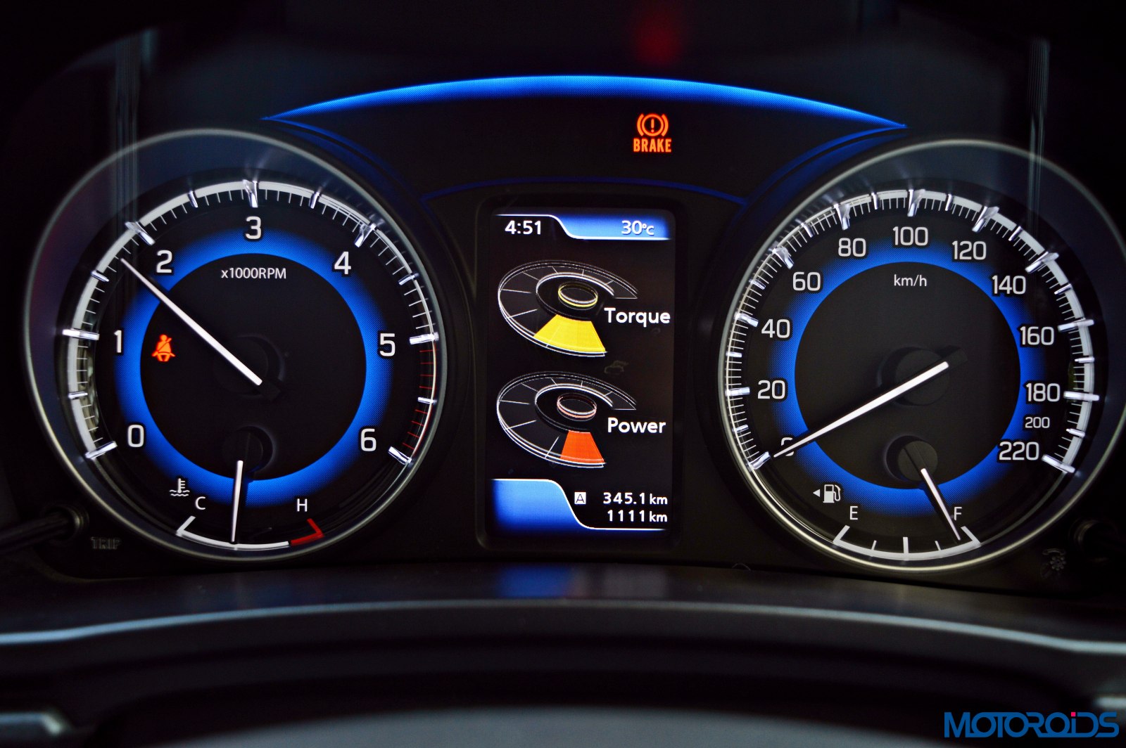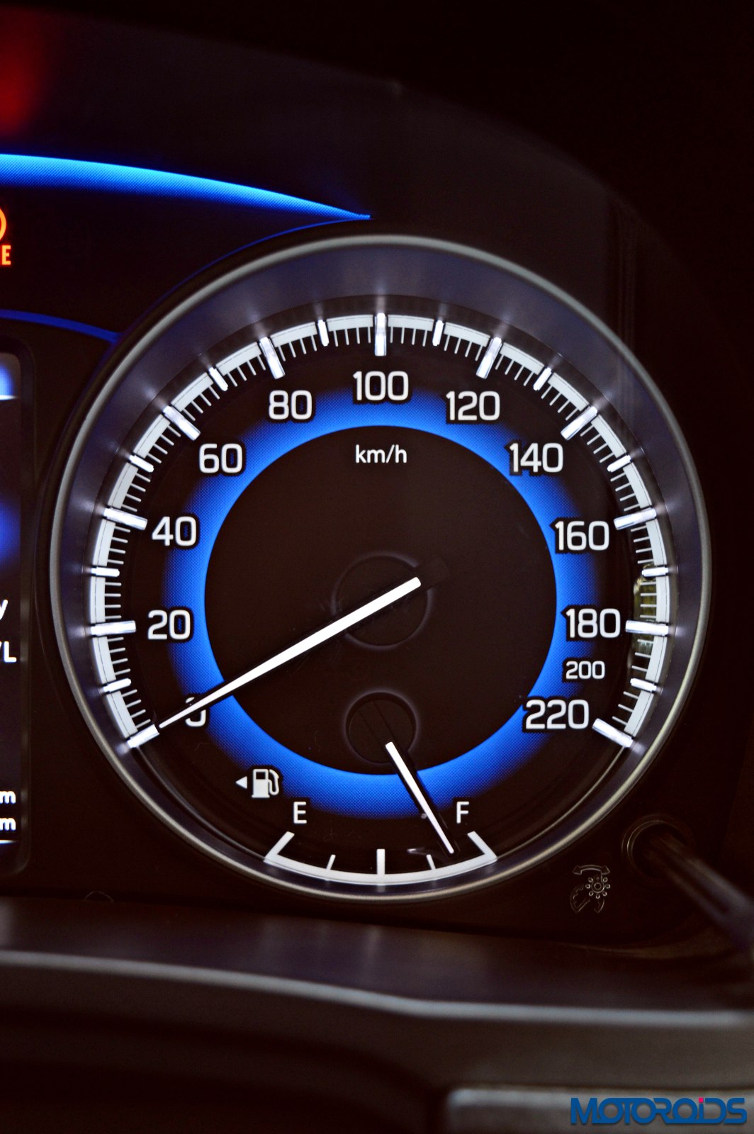 The driver is greeted by an instrument cluster that gets two hooded dials, the core of which mimics a rather blue eclipse. Analogue reading for the speedometer, fuel level, temperature and engine speed makes life easy as one isn’t confused with too much of digital stuff happening in a small area. Tell tale lights glow within the tachometer, a couple of them below a blue arch that connects both the dials.