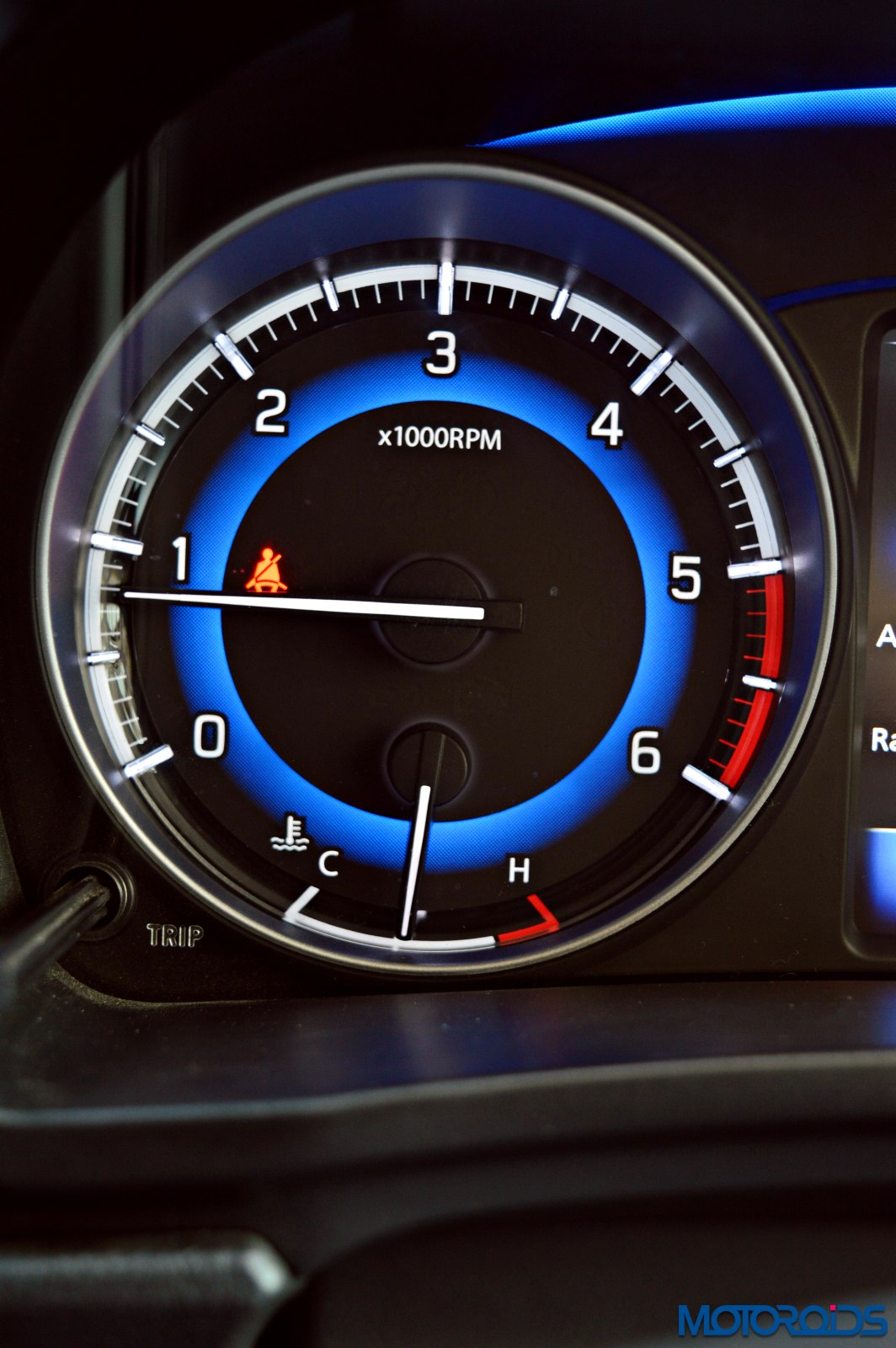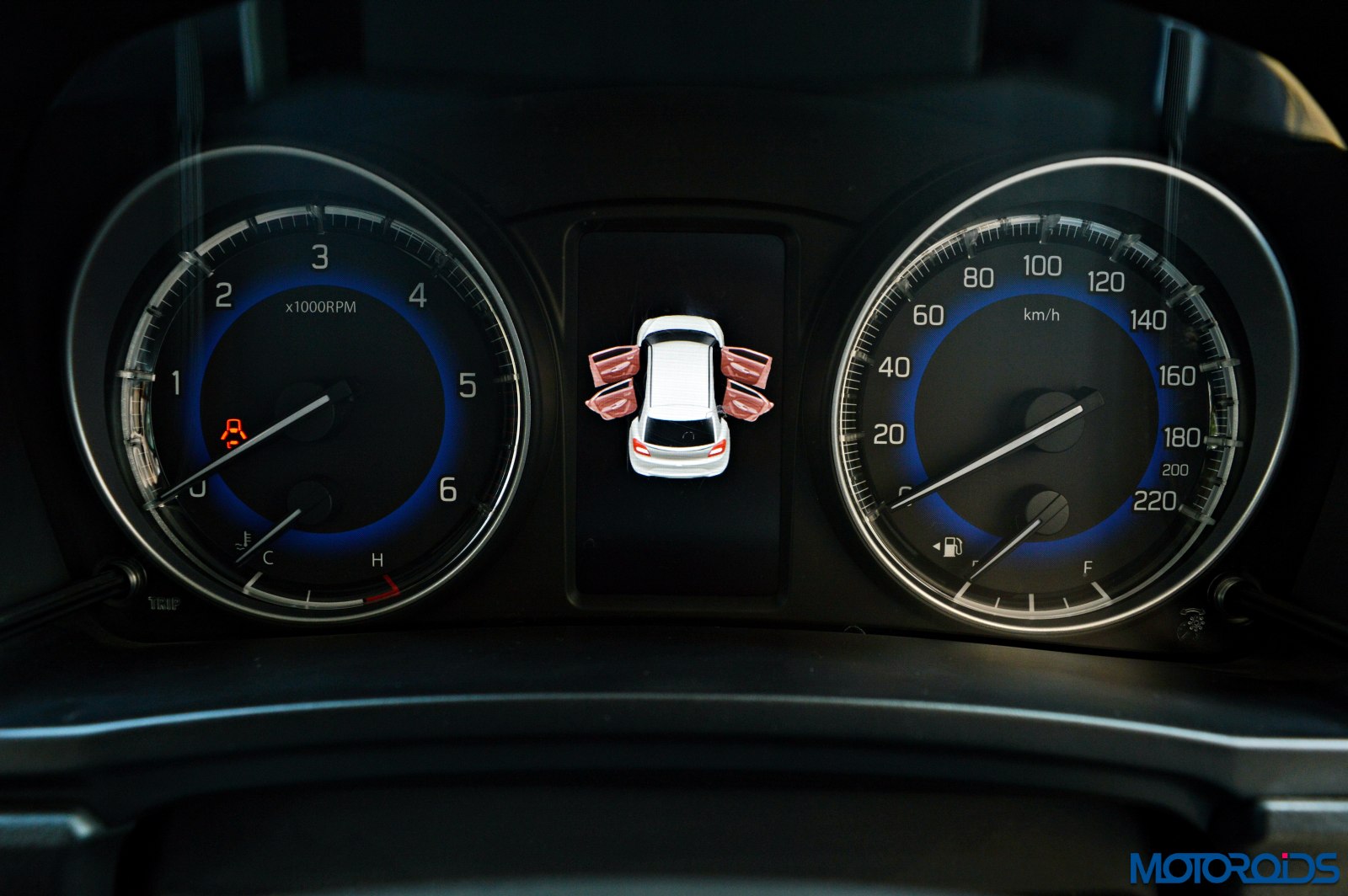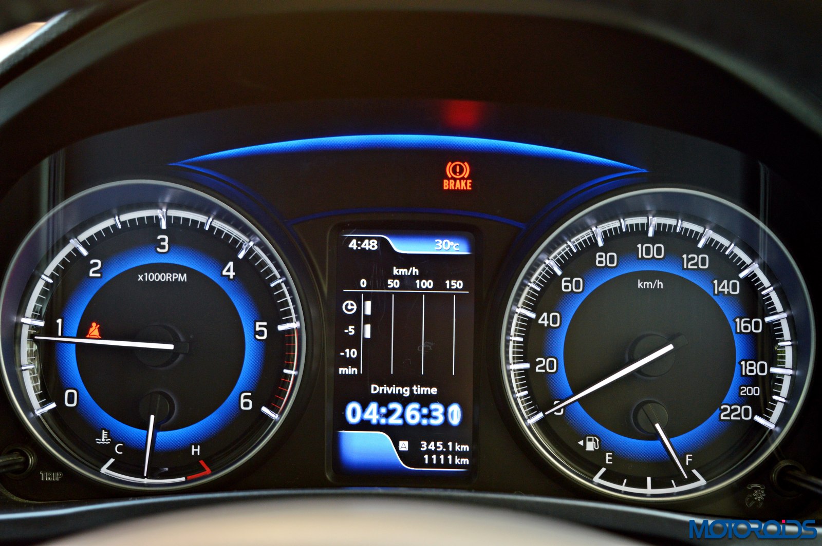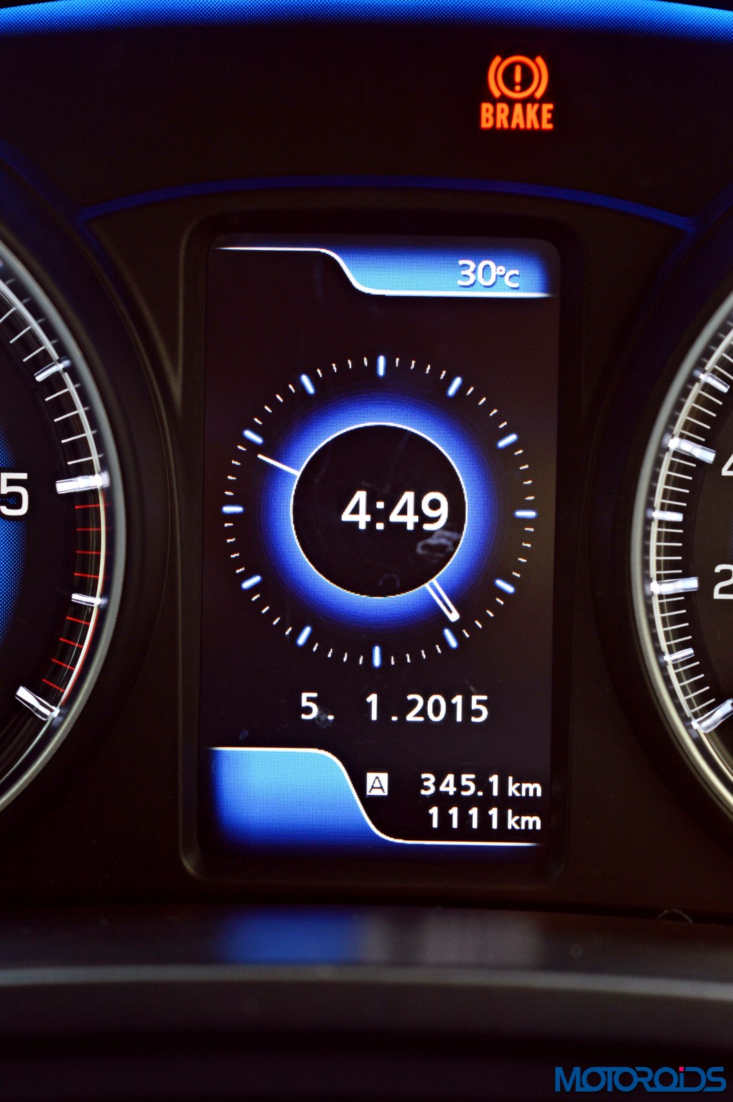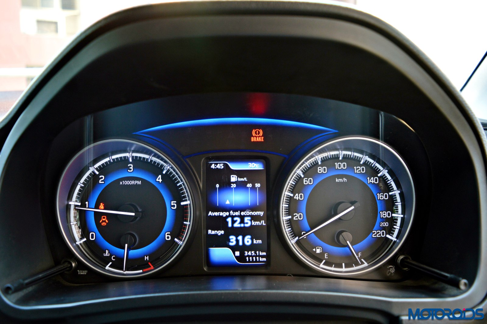 The driver is greeted by an instrument cluster that gets two hooded dials, the core of which mimics a rather blue eclipse. Analogue reading for the speedometer, fuel level, temperature and engine speed makes life easy as one isn’t confused with too much of digital stuff happening in a small area. Tell tale lights glow within the tachometer, a couple of them below a blue arch that connects both the dials.
