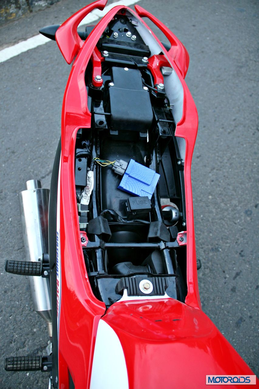 Also the bike has been stripped of the main stand, saree guard, rear footrests and the kick starter to aid further weight saving. Even the small size vibration dampners weren’t spared.