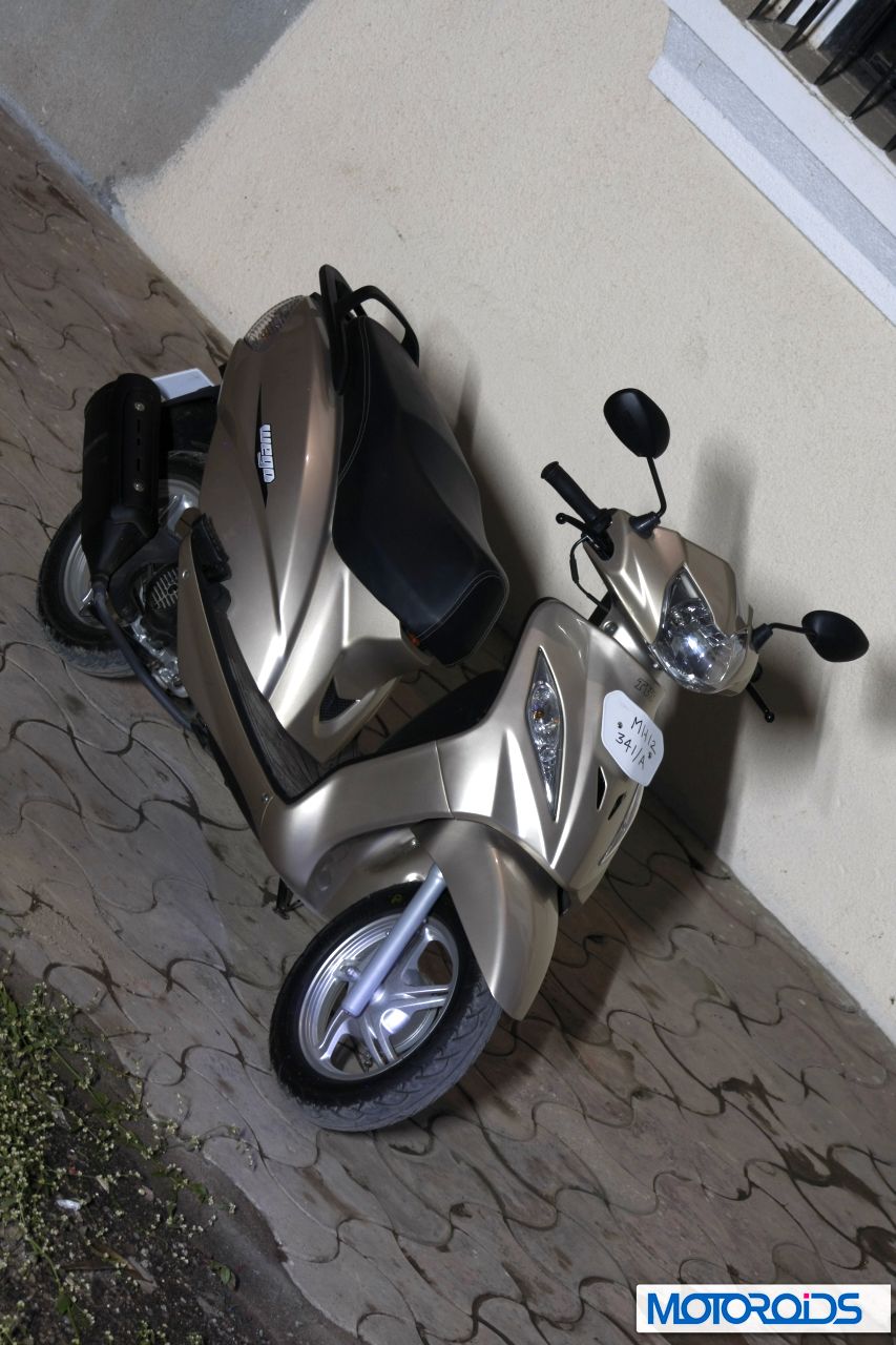 To start with, the Wego, just like any other sensible commuter-scooter features a 110cc engine, putting out a respectable 8bhp of power and a little more than 8Nm of turning force. The most noticeable visual aspect of this scooter is its big 12-inch alloy wheels, which make amply clear its intentions to target the Honda Aviator squarely. But while the Aviator is a radical, rather unconventionl looking machine, the Wego is a visual delight. It complies to the traditional school of scooter design, but with a dash of freshness. Unlike the Scooty, the Wego doesn’t have its front panel extending as a mud-guard. It goes the conventional way with a proper mud-guard and has steel body – something that we Indians associate with ruggedness and durability for some reason. The Wego is big and substantial too, not only to look at, but from the saddle as well – something which we Indians associate with more value. The Wego doesn’t challenge or defy the traditional Indianmindset – it complies to the fundamentals of the market and introduces novelty without attempting to be overly bold. Wego’s girth is a big positive for it, but surprisingly even with those relatively large dimensions, the Wego manages to look elegant and sporty at the same time.