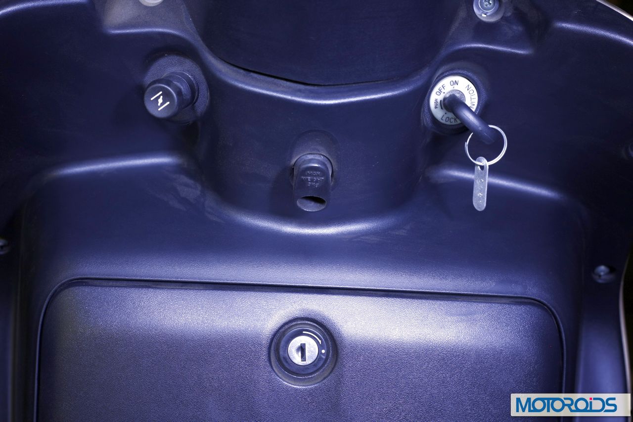 There is an interesting inclusion in the tail-lamp cluster of the Wego. The semi-circular cluster has a hexagonal brake light which has three lines of opticcal guides a la the BMW 5-series ‘moustache’ pilot lamps and its red tail-lamps. The guides glow as the brake lights are applied, giving the Wego’s rear its distinctive look in the dark. This is the first time in the country that a bike maker has tried something of that sort. While the novel inclusion is welcome, we think the idea could have been better executed. There are a few other neat touches too. The fuel cap is positioned behind the seat and pops out with the twist of the key in the slot placed on the panel under the seat. The fuel filler cap is specially designed to look as classy and substantial, ‘as the filler cap of a car’, if the TVS boffins are to be believed. It looks nice, though its not as convenient as the front placed inlets featured on some other scooters. The instrumentation is basic with a speedo and fuel-gauge with usual turn-indicator lights. There is a power outlet for cellphone charging, powered by a maintenance-free battery. Then there is the patented EZ stand which really makes light work of putting the scooter on the mainstand owing to its specially designed lever.