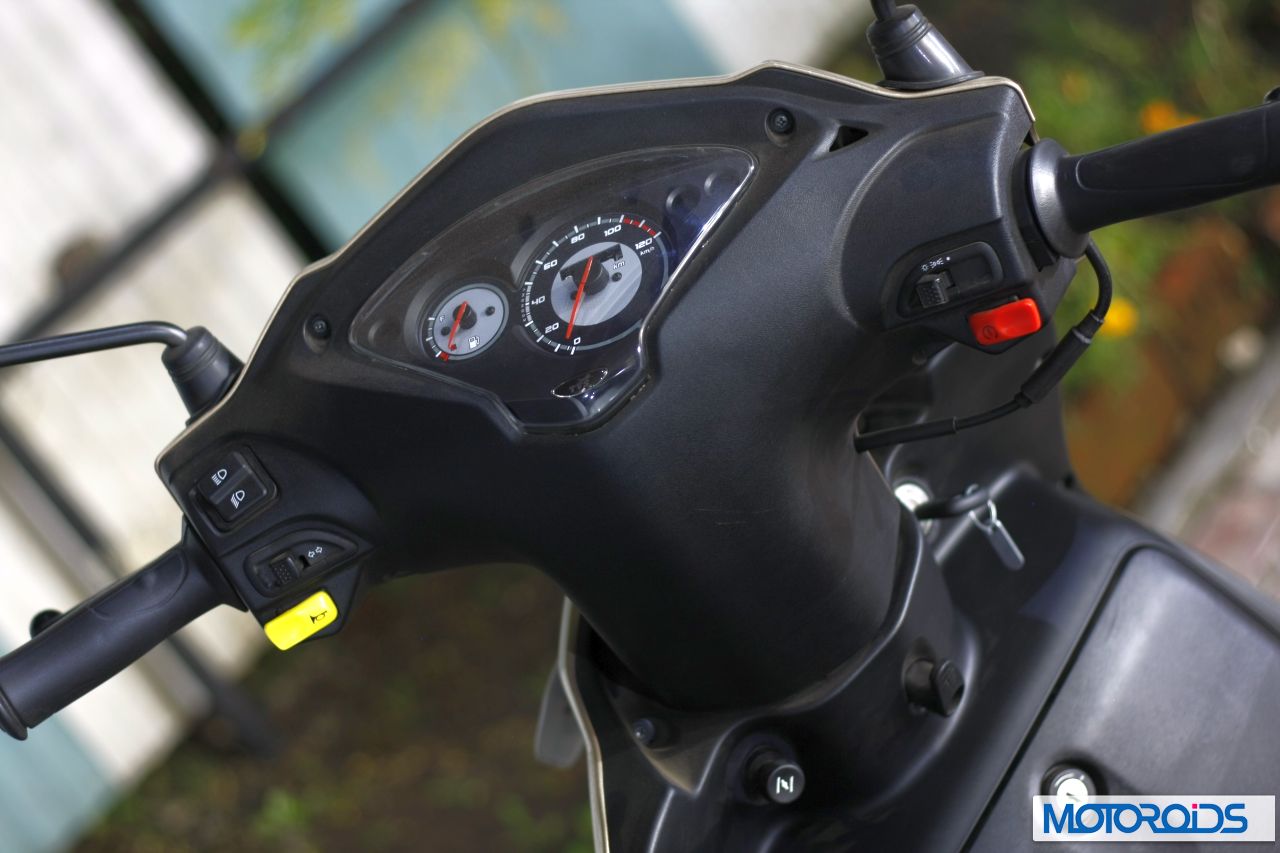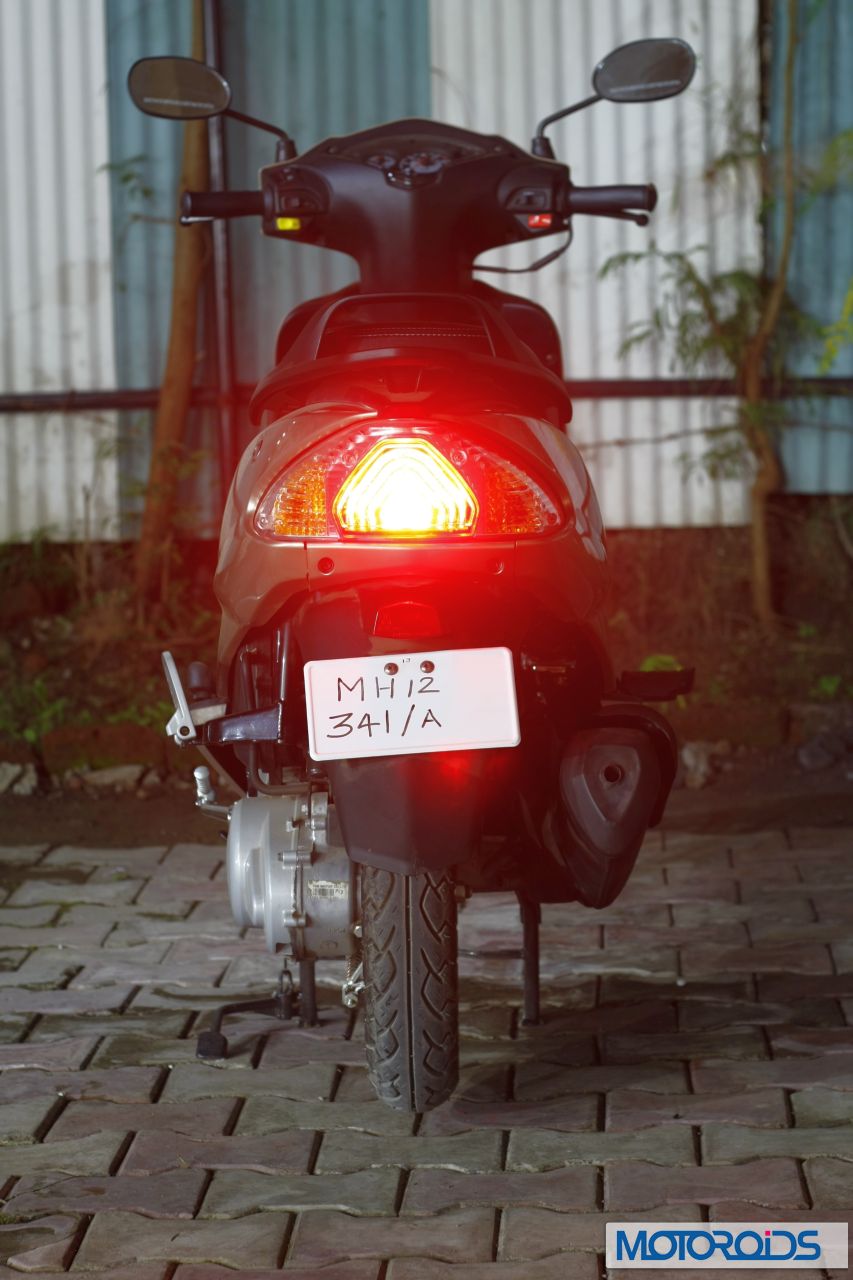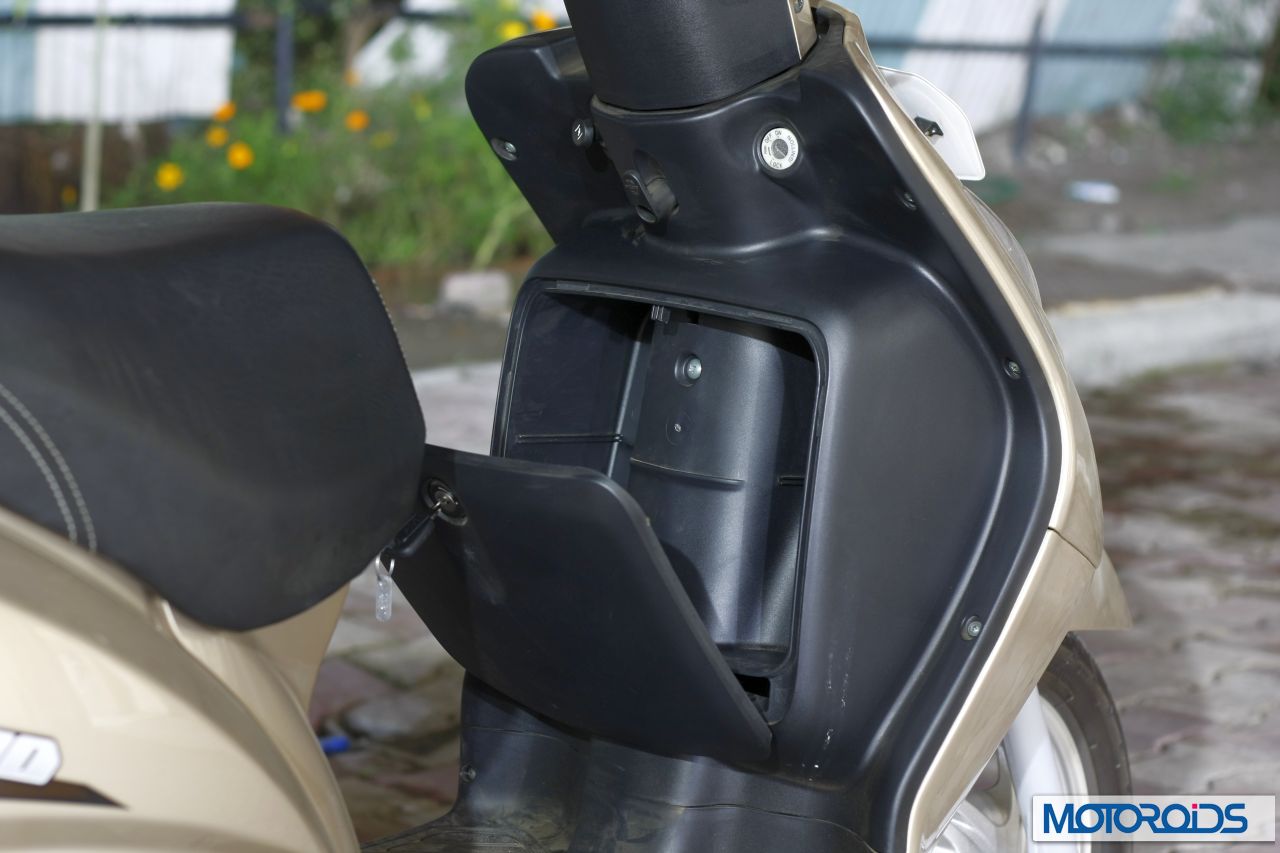 The Wego is a fresh design, and it has been built from the ground up. I think the designers at TVS need to be congratulated for having been able to execute something so well proportioned in the first attempt. The Wego has a chiseled, slanting nose with vertical blinkers. Interestingly, the snout also features two small ‘nostrils’ which somehow remind me a little of the new Acitva. Overall, the front part of the Wego looks nice, and showcases a good balance of tension and elegance. It is, however, the central-rear part of the Wego that really delights design-wise. The rear of the scooter originates from the footboard in the form of an arc that culminates into the terminal part of the body above the tail-lamps. A crease divides the side panel of the Wego into two horizontal parts. Interestingly, when looked at closely, the upper part along with the tail-lamp resembles a shark leaping out of water, with the keyslot to unlock the seat falling in just the perfect place to make the eye of the creature. Overall, the lines of the Wego look distinctive, yet well proportioned and pleasing to the eye. It somehow manages to look elegant even after being bigger than even some of the 125cc scoots. The Wego has something about its design that makes you stop and have a look at it.
