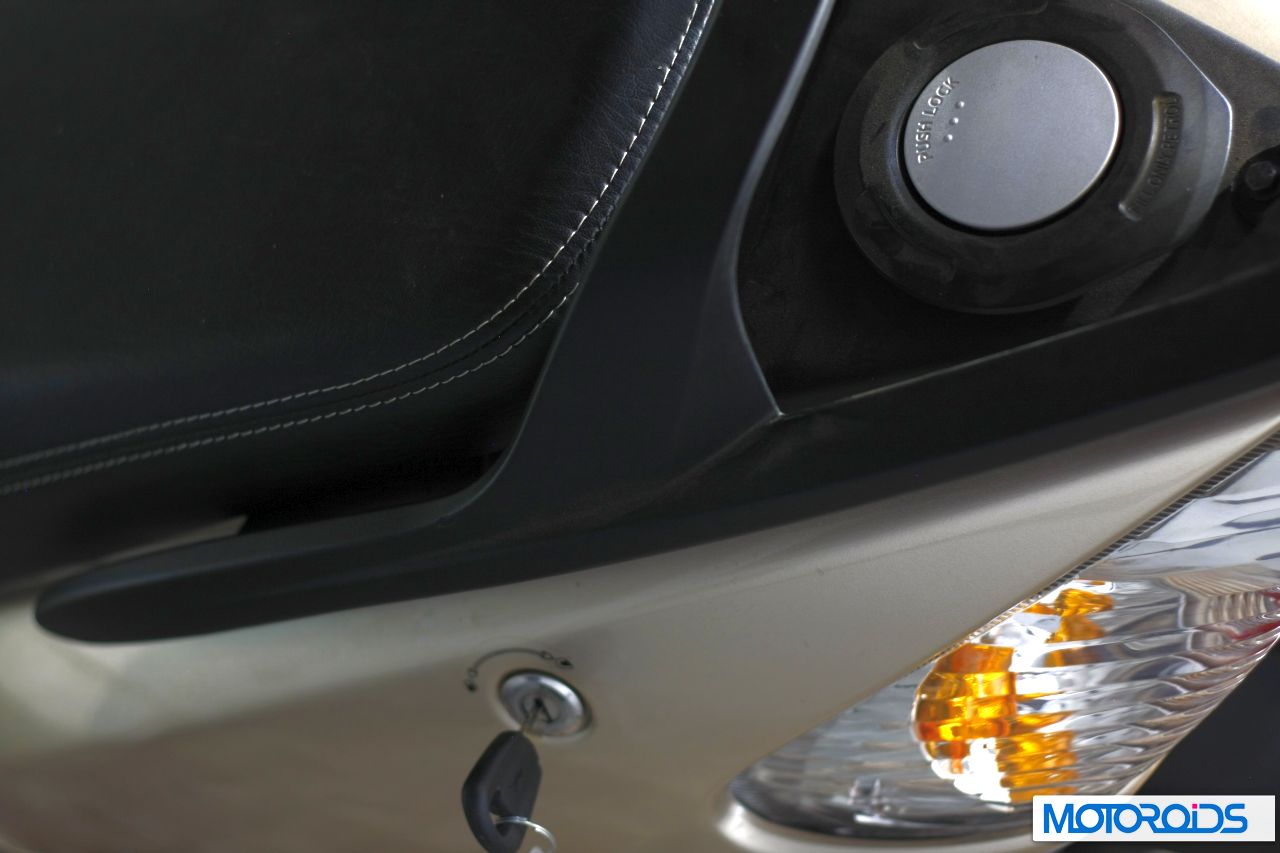 Once it gathers good pace, the Wego feels remarkably smooth and vibe free. It gathers pace with confidence and never fails to make you feel increasingly reassured with its brilliant engineering and build quality. The big wheels augment stability at high speed and the Wego feels rock solid even at 60+ speeds. The telescopic front suspension and gas charged rear suspension make the ride quality of the Wego stand out from the rest of the crop. Not only does it feel stable at high speeds, but also accounts for better damping and resultantly a more comfortable ride over undulating and rough surfaces. The Wego also features what TVS like calling the Body Balance technology, wherein the engineers at TVS have facilitated minimal steering effort, better control and maneuverability by distributing the mass of the vehicle optimally. The experience from above the saddle is that of a refined, well-engineered and phenomenally well sorted machine which is built to last a lifetime.The Wego spells quality, no matter which part of it you look at. The plastic bits, the paint quality, the panels assembly, the up-market fuel cap – you can make out that TVS have gone the whole hog to make sure that every minor issue is ironed out before the vehicle hits the road.