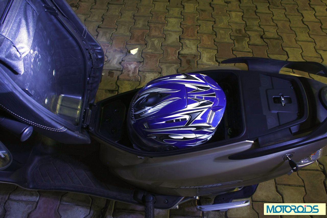 There is plenty of space under the seat. The hinged seat unit is cavernous enough to swallow your usual full-face helmet. However, if you own one of those imported ‘horny’ helmets with air-intakes then youmay have to find another place to park your lid. There is a decent amount of space in the front locker as well, which surprisingly doesn’t hamper the leg space at all! The seating position is nice and comfy and the seat is just the right width and has the foam with right density. There is ample seating space for two, and even with two heavyweights like Rash and myself on, the Wego didn’t feel cramped.The saddle height too, unlike the Aviator isn’t too lofty and makes the Wego a connvenient scooter to ride for ladies as well.