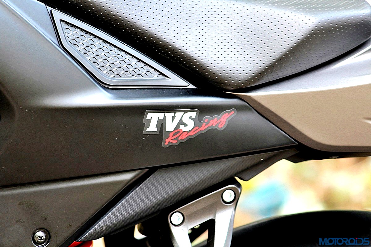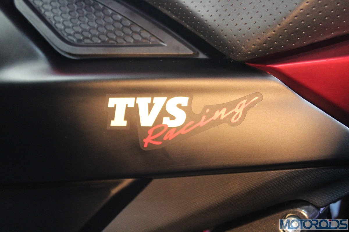 An asymmetrical, aircraft style fuel filler cap and blacked out middle section complete the fuel tank’s appearance from the rider’s perspective. We think it all looks trendy and muscular so far. The middle section is smeared in black, hiding all the details apart from the TVS Racing badge.