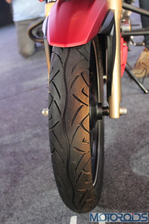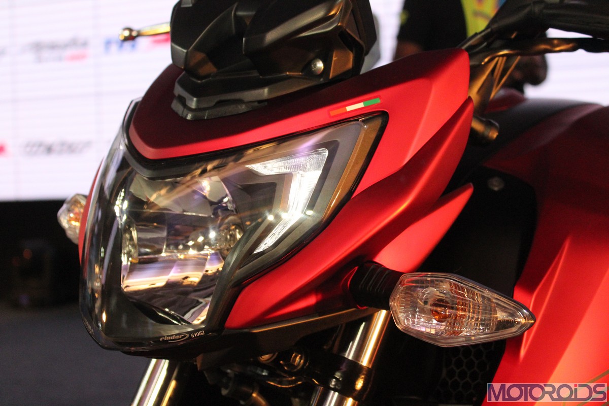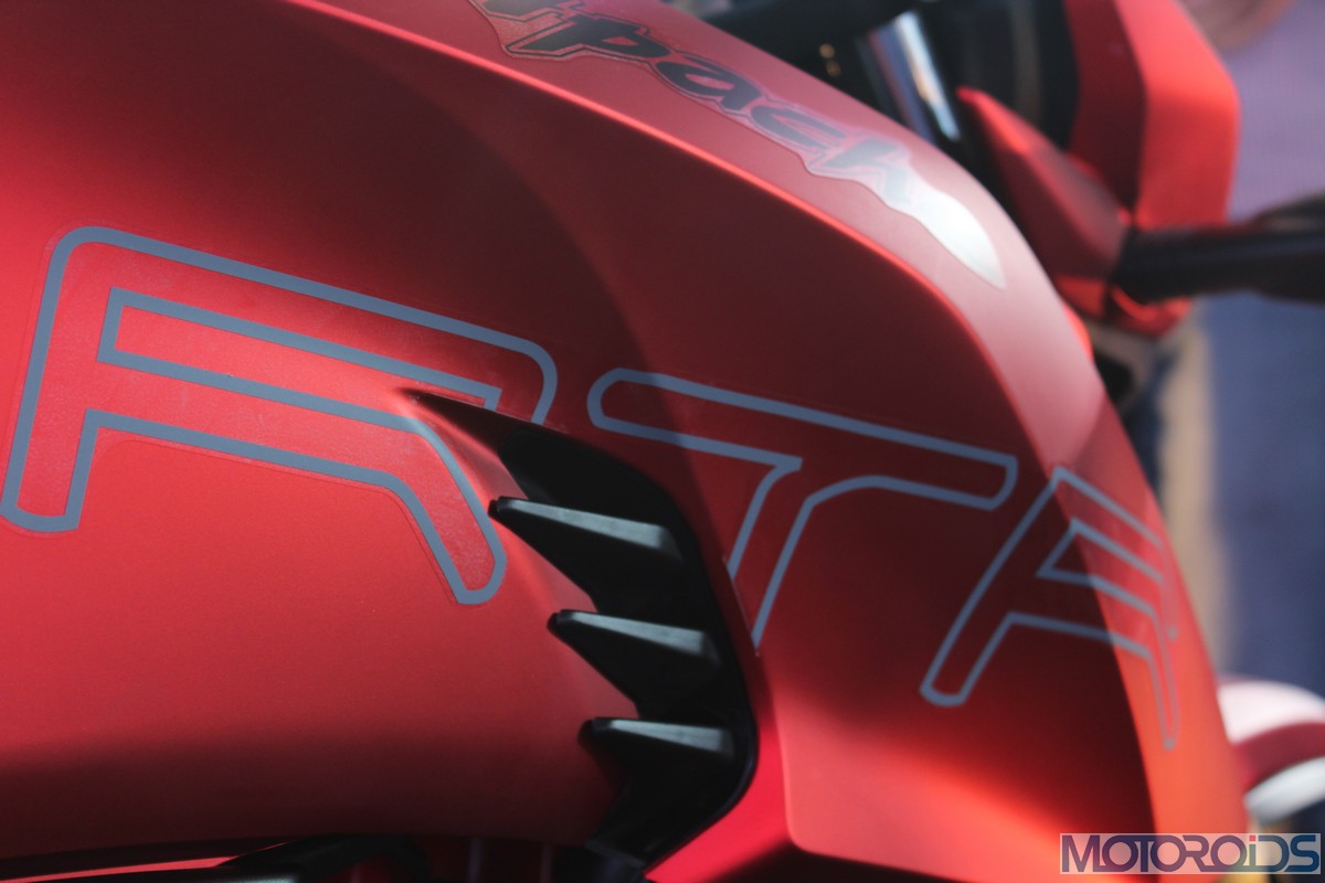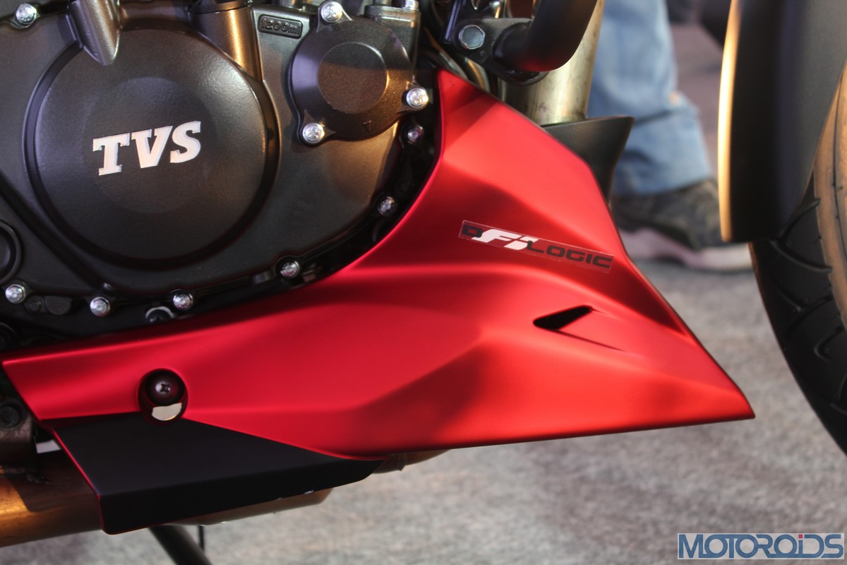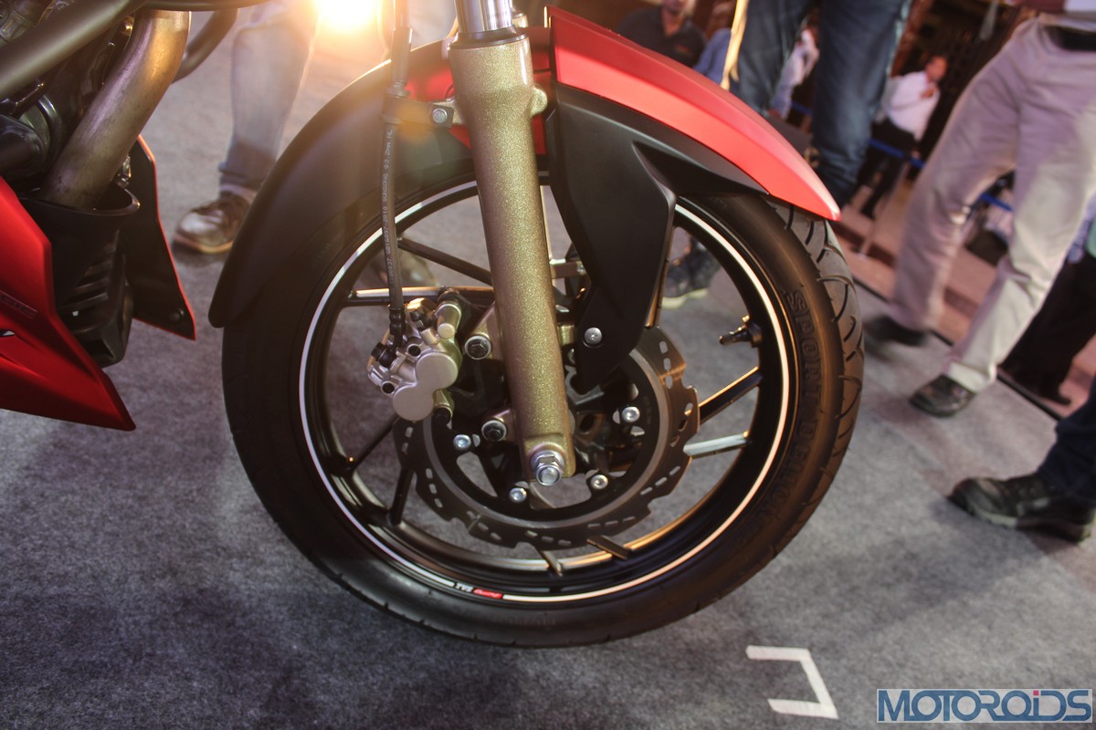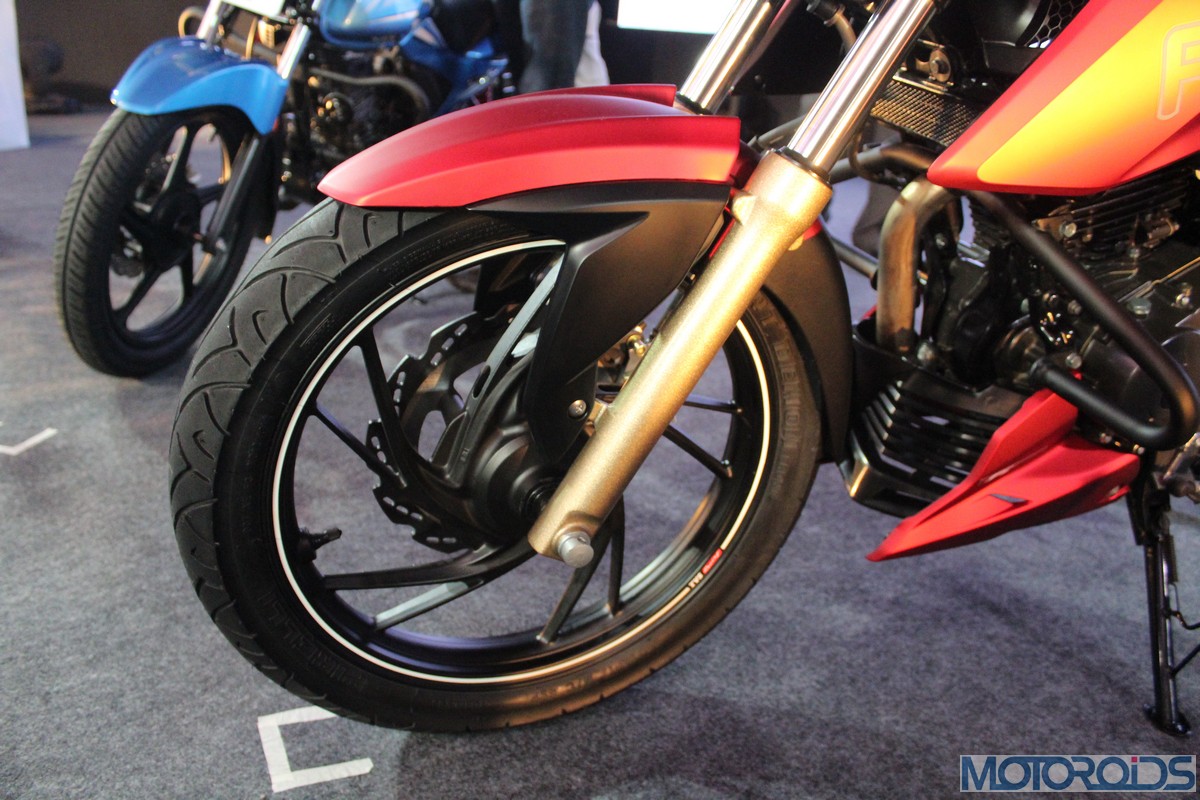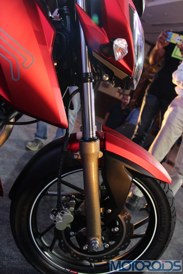 The front fender hasn’t been spared the chisel as well, with edges that rise up like stubby horns on both sides, along with a subtle midriff; setting the styling theme for the top of the fuel tank. The section which falls along the matte gold finished front forks has been blacked out to stick to a theme. White pin-striping on the rims interspersed with TVS Racing decals look the part.