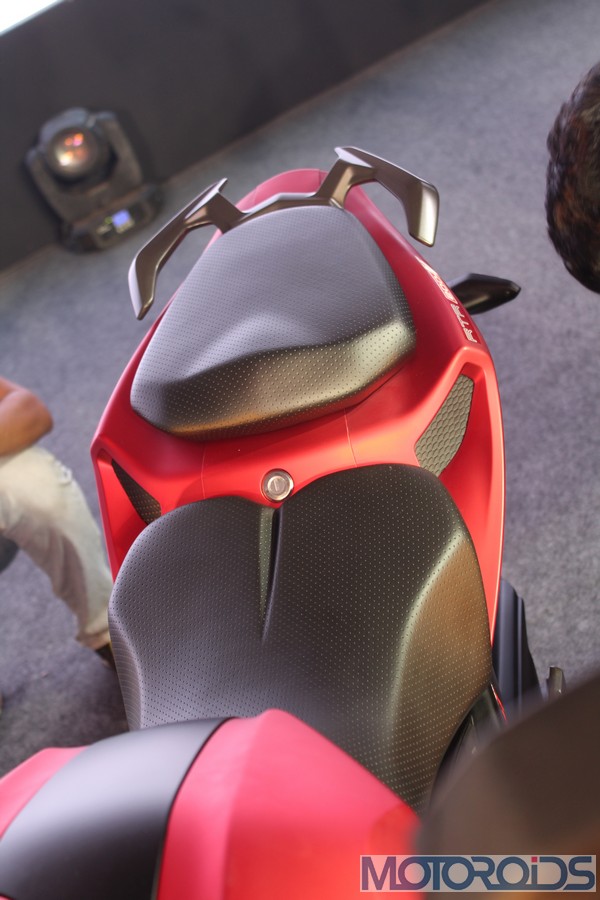 The split seat looks quite pert and dare I say, the front seat’s shape is an innuendo there for the taking. The pillion section can be completely taken off to access a small storage compartment for storing whatever things people store inside motorcycles. Yes, it’s a bit small.