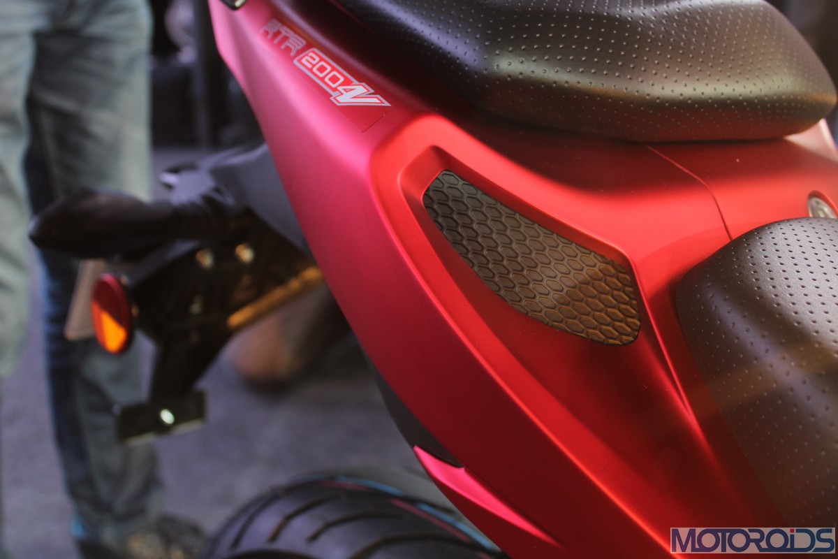 Bodywork caves into the middle of the Apache 200’s slim, LED tail lamp; thereby associating itself to the Apache family. The single piece grab rail atop syncs in with its antlers too.