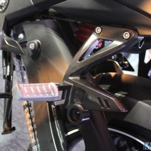 The all-digital instrument console shows a tachometer sans red-lining indicators placed on top of the panel. A digital clock, gear position indicator and a service reminder icon is huddled to the left of the panel. The speedometer sits at the center of display with a fuel indicator below it. The display’s actually a bundle of information, and keep the geekier streaked riders happy. One gets a lap timer and two trip meters. It’ll even record your top speed 0-60 km/h sprint time. Tell-tale indicators like turn lights, fuel, neutral, ABS indicator, are placed on the plastic panel housing the digital display.