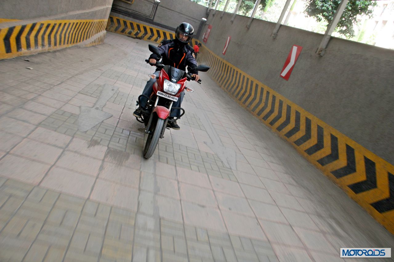 • The front end of the bike lightens up when riding, and hampers confidence in chock-a-bloc traffic- more so with a pillion around. Though manoeuvring this baby is a breeze.