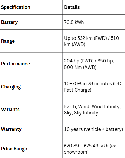 The Wind variant adds ADAS Level 2, ventilated seats, power tailgate, and fast charging. Sky and Sky Infinity trims bring AWD, panoramic roof, and performance upgrades, making them feel like proper luxury EVs.