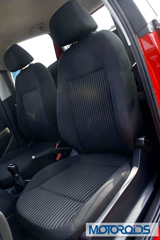 The spacious seats are clothed in `Livon` Titanium black upholstery and look classy while complementing the interior theme. They offer generous support and padding while also having height adjustability on the driver side. The Cross Polo`s interiors have many places to stow away belongings. The central console has twin cup holders placed ahead of the gear lever. A conveniently positioned cigarette ligther /12v socket is between the cup holders and a deep receptacle under the HVAC controls. The door pads have integrated bottle holders; and to break the monotony, you find a lot of silver bezels and surrounds in the interior which up the premium feel.