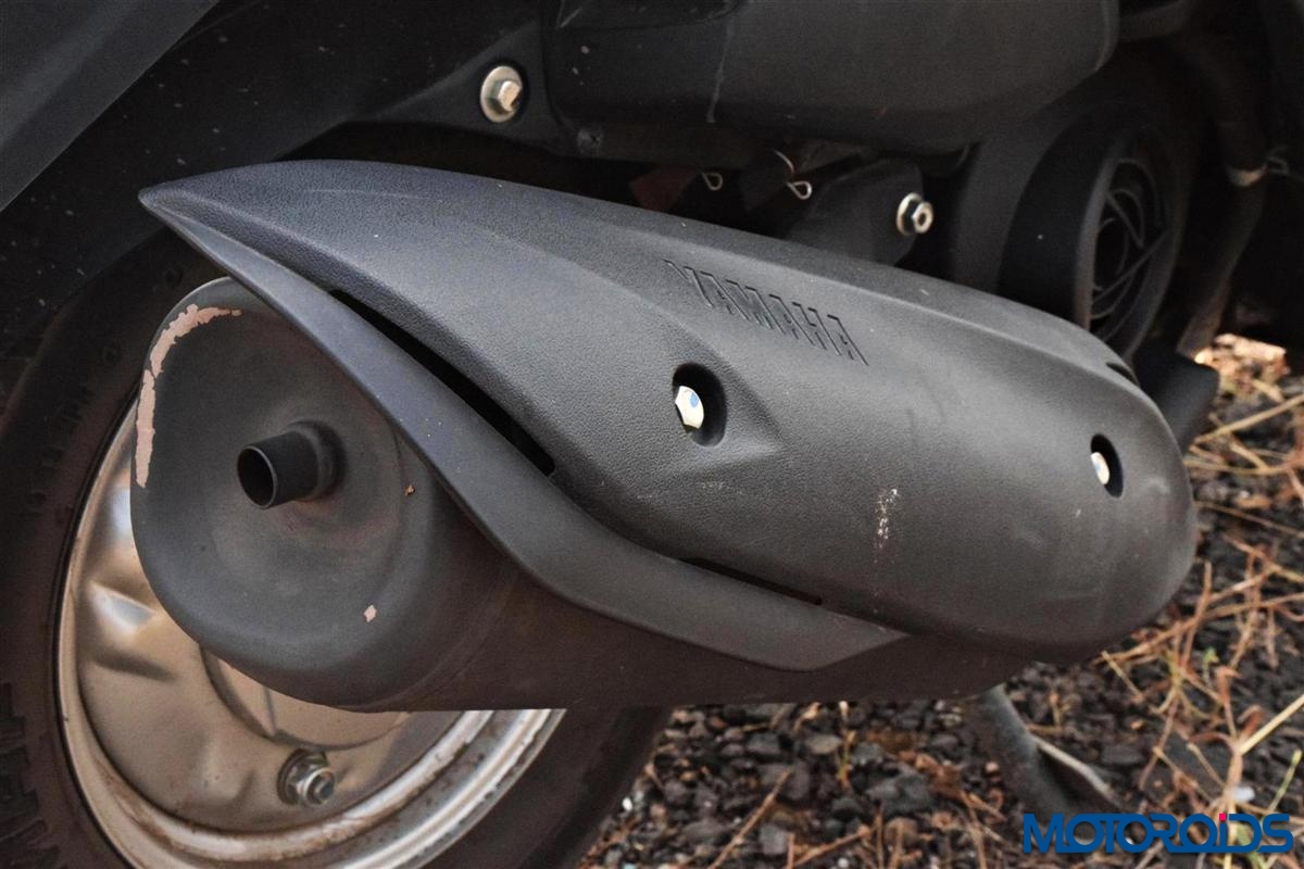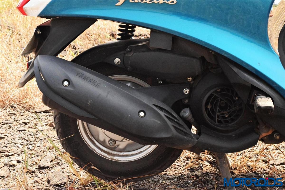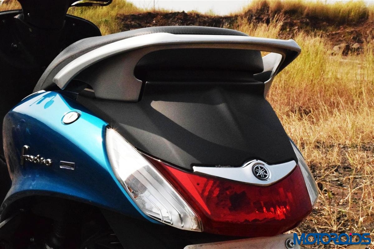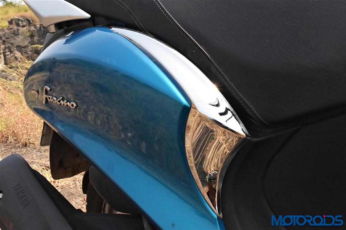 The rear sweeps in the utmost curvaceous fashion with chrome accents on the side panels and the 3D emblem raising the allure for the Yamaha Fascino. The rear is refreshingly different from the relatively analogous look found on most scooters and testifies that designers of the Fascino weren’t depleted of motivation by the time they made it to the tail. The paint, chrome accents and the matt grey panels merge well offering a contrast that looks appealing to the viewers eye. We do have the complete details covered in our features photo tour:
