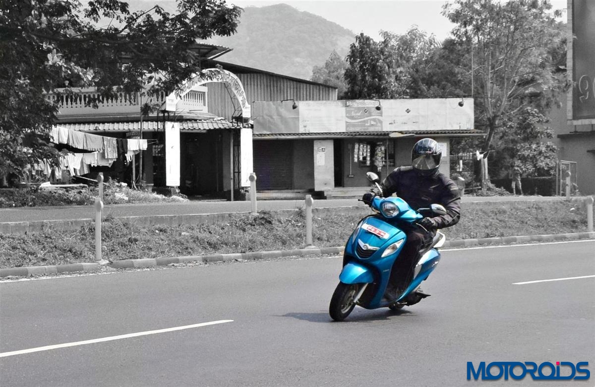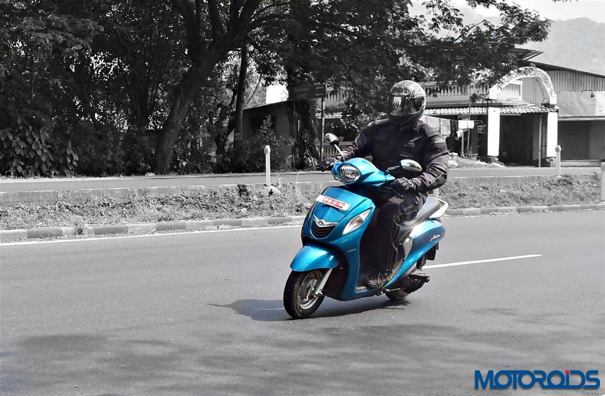 The Fascino exhibits handling traits similar to the Yamaha Ray. Despite larger proportions – it retains the agility and flicks around in traffic with minimal effort. It holds up well in the straight line at high speeds and feels extremely predictable going around corners. One could just keep the throttle pinned at max and dive in and out of corners without a hint of nervousness. The brakes too feel similar to the Yamaha Ray and impart adequate bite to shed speed or squeeze to a quick halt. The 10 incher MRF Zappers at both ends offer decent bite into the tarmac during spirited riding and hard braking.