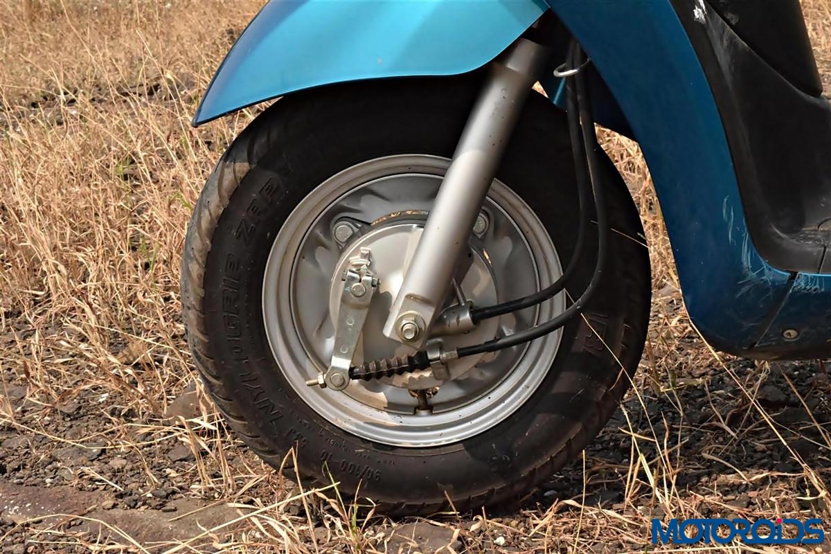 • 90/100-10 MRF Zappers at both ends offer decent amounts of grip under hard riding and braking