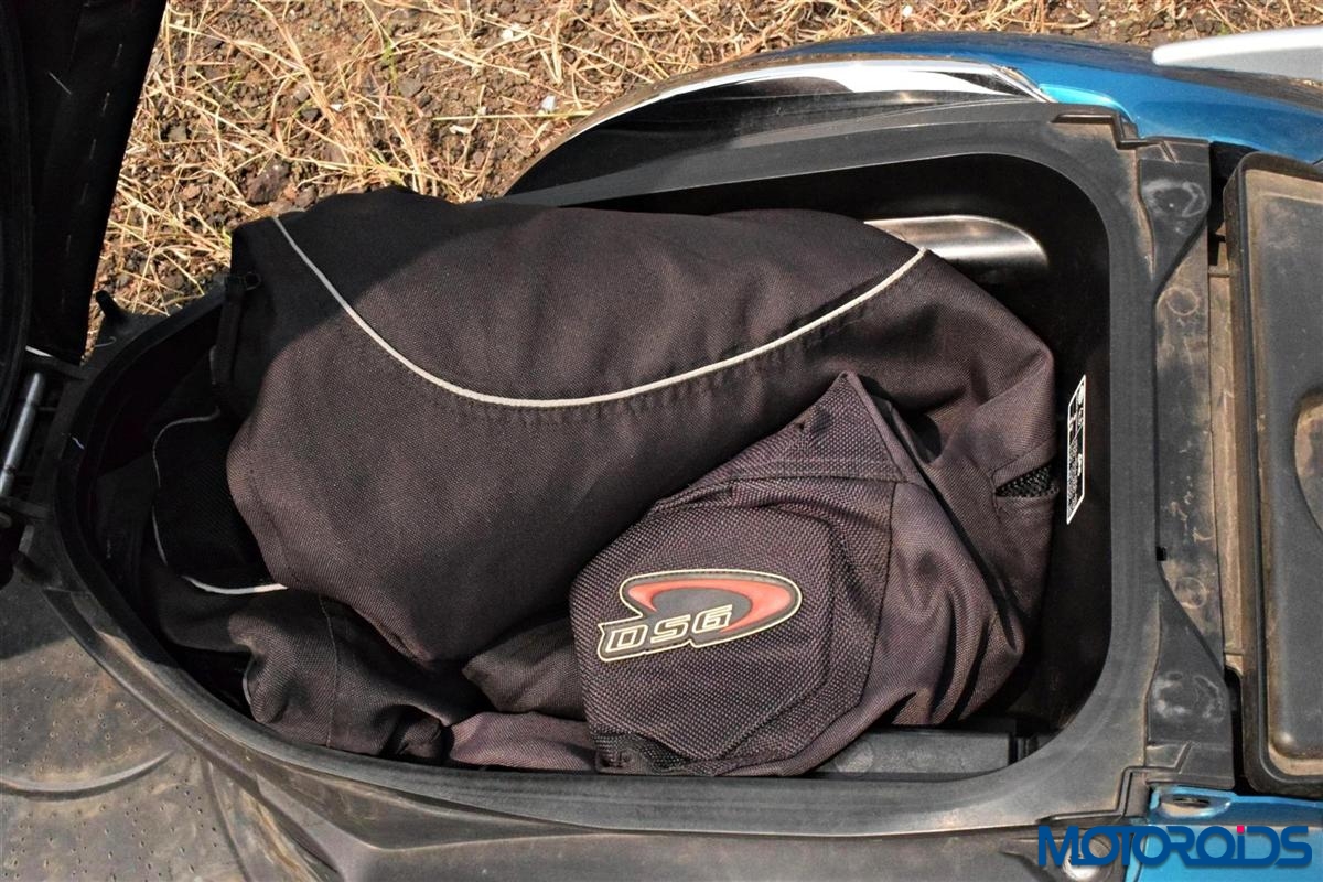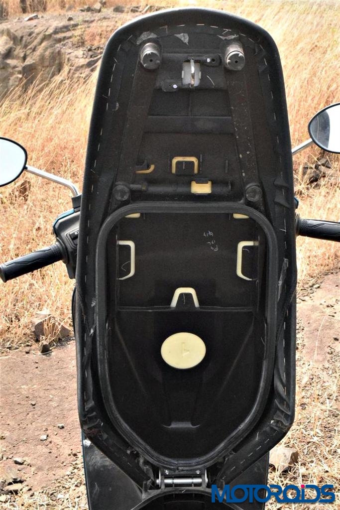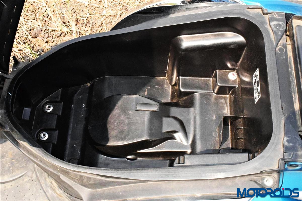 • The underseat storage apart from swallowing the usual grocery purchases can accommodate a medium size helmet. Place a large size helmet inside and the seat won’t lock.